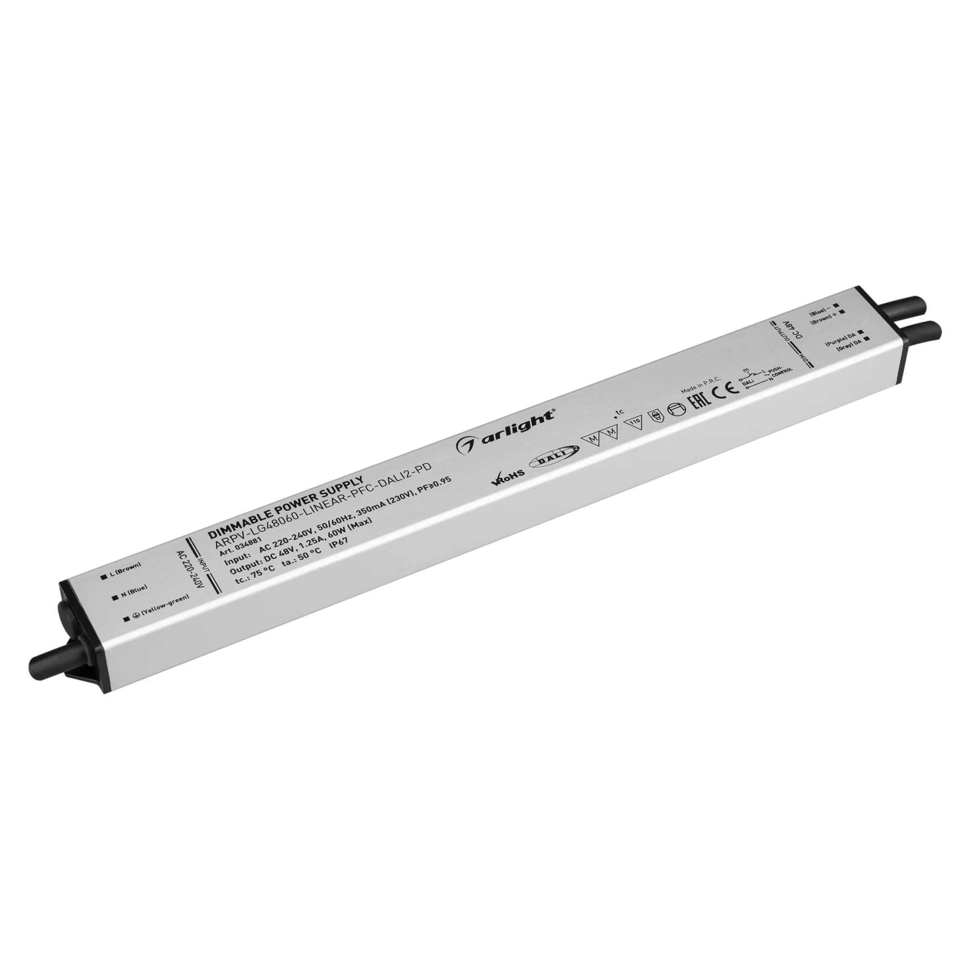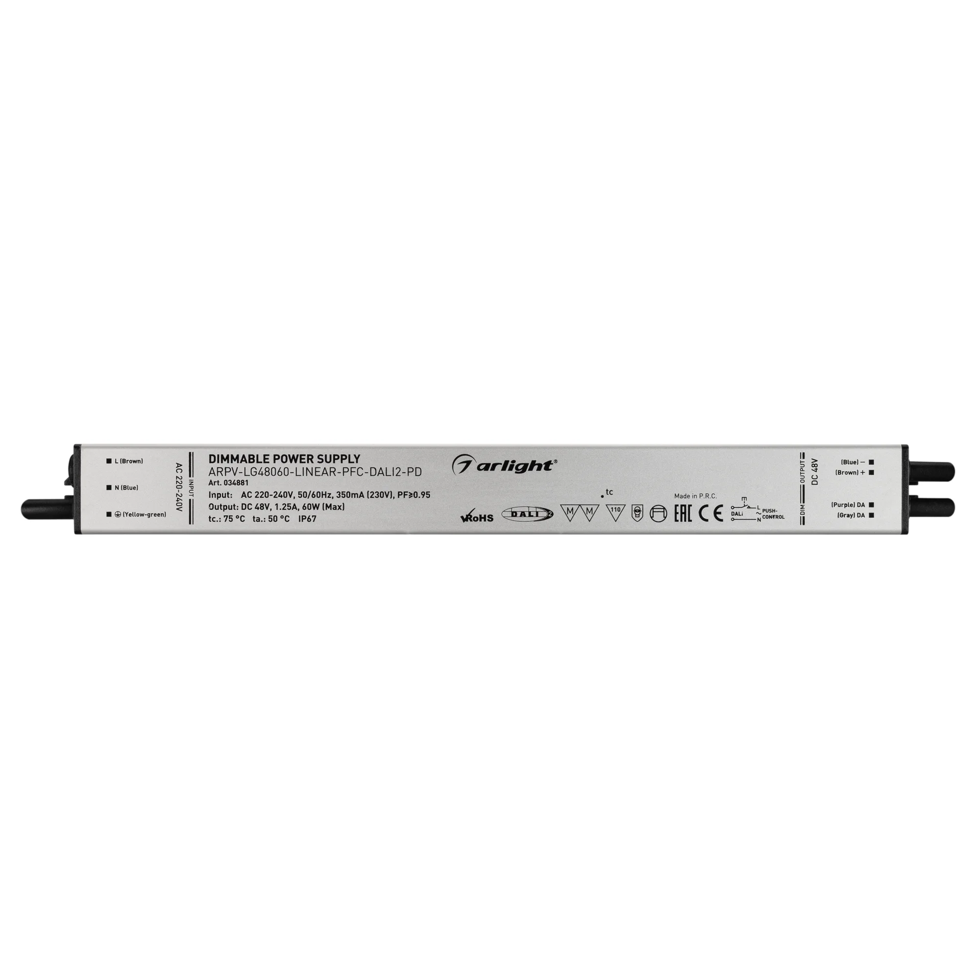 Диммируемый блок питания 48V с гальванической развязкой, ток 1.25А, 60Вт, с управлением DALI, c функцией PUSH-DIM, с корректором мощности, PF>0,95. Тонкий металлический корпус IP67. Вход: 220-240VAC. Выход: 48VDC, ШИМ 1кГц. Размер 290х30х21 mm.. Соответствует требованиям EMC. Гарантия 5 лет. Допускается использование только внутри помещений.