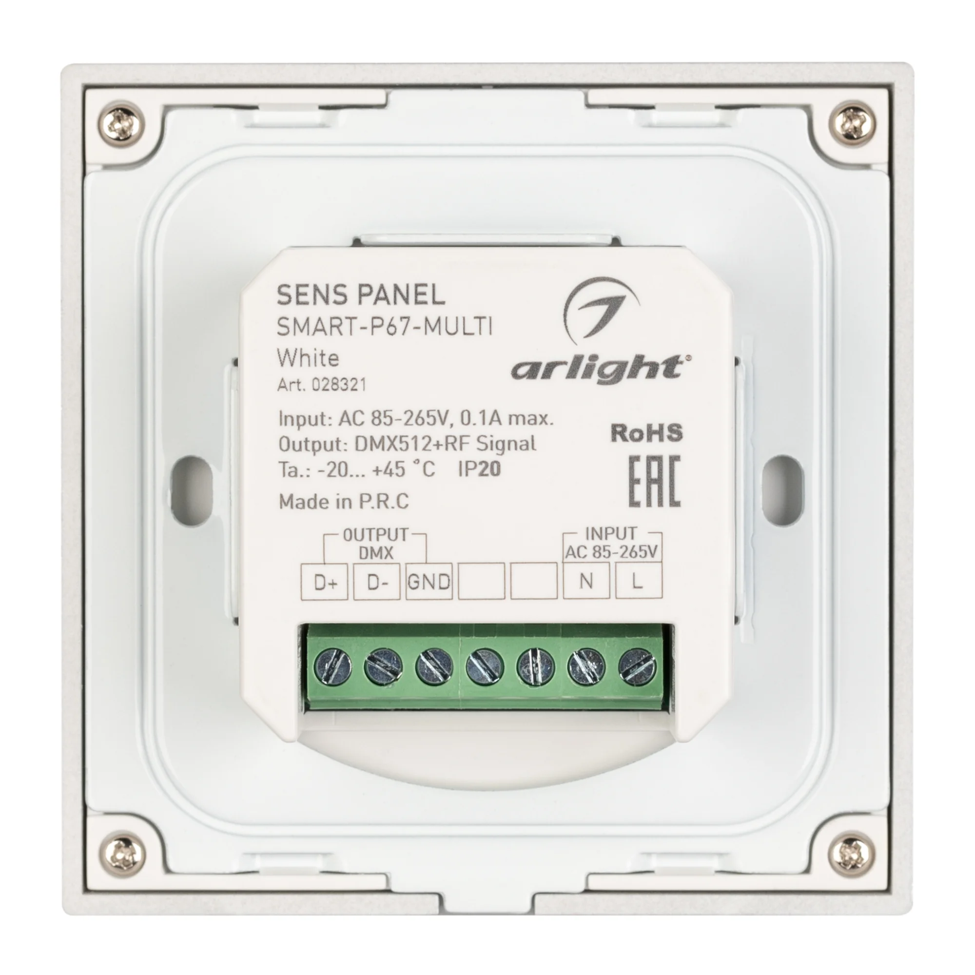 Встраиваемая сенсорная панель 2.4 ГГц, цвет белый. Материал — стекло. Для управления RGB+MIX (5-канальными) источниками света (ШИМ), 4 зоны управления. Питание/рабочее напряжение AC 100-240V. Функция управления DMX512 устройствами. Габариты 86х86х36 мм. Панель совместима с контроллерами серии SMART.