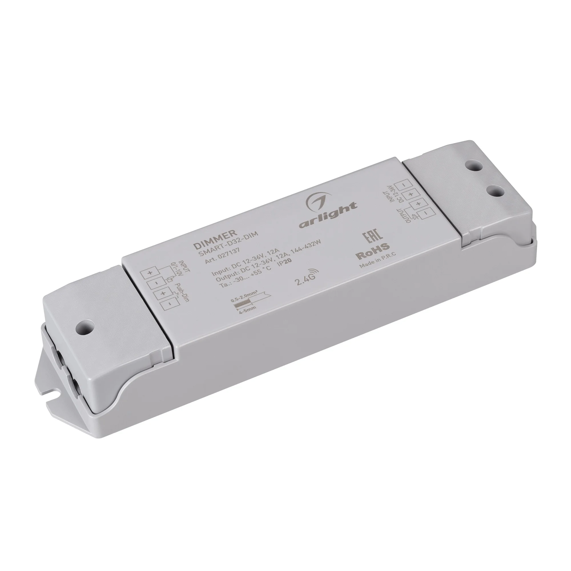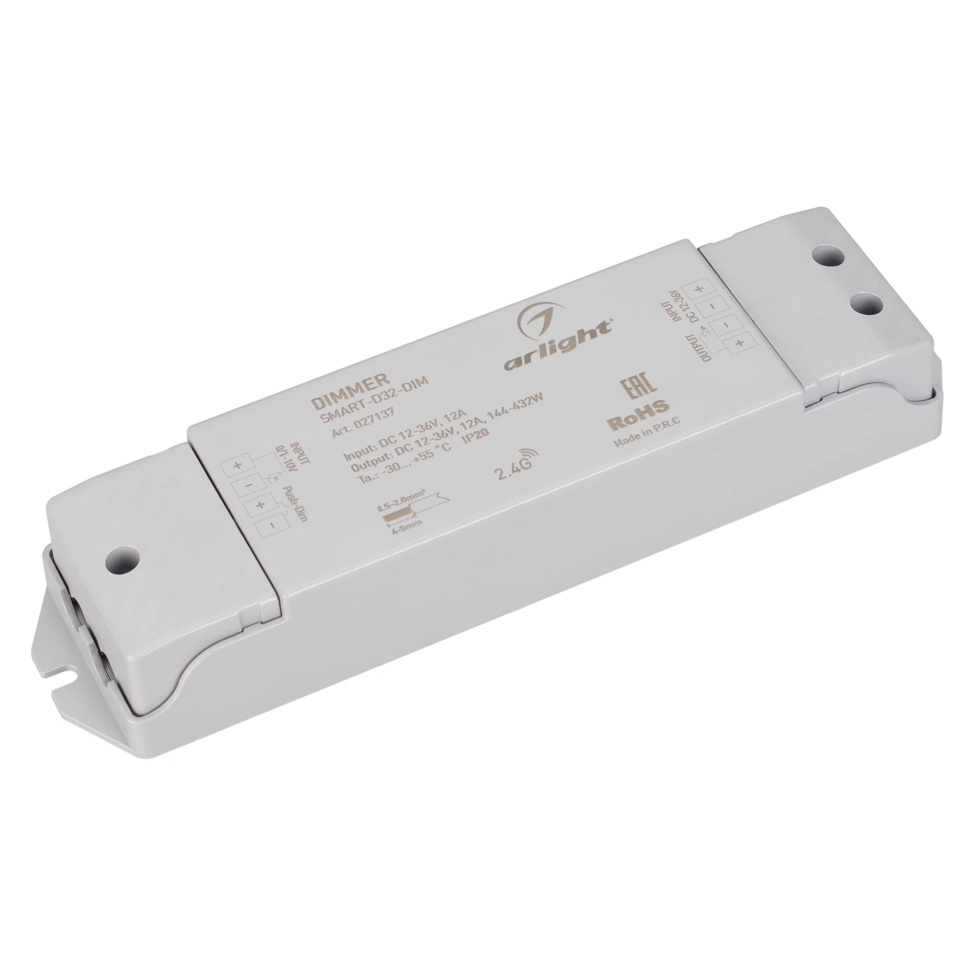 Диммер для одноцветных источников света (0/1-10V). Питание/рабочее напряжение 12-36VDC, входной/выходной ток 12А, выходная мощность 144-432W. Корпус — PVC. Габариты 175х45х27 мм. Наличие функции Push-Dim. Управляется 0/1-10V панелями серии SMART (поставляются отдельно).