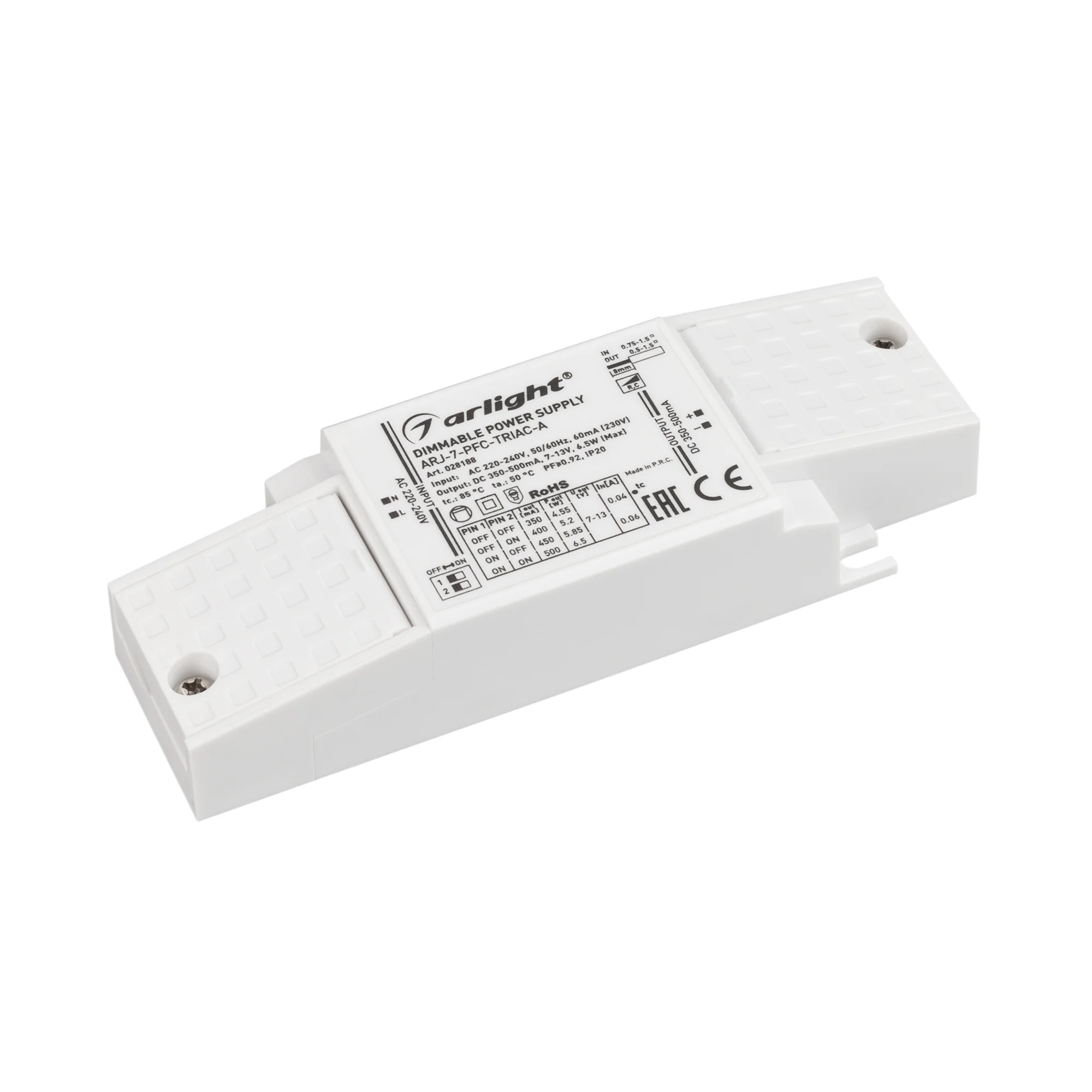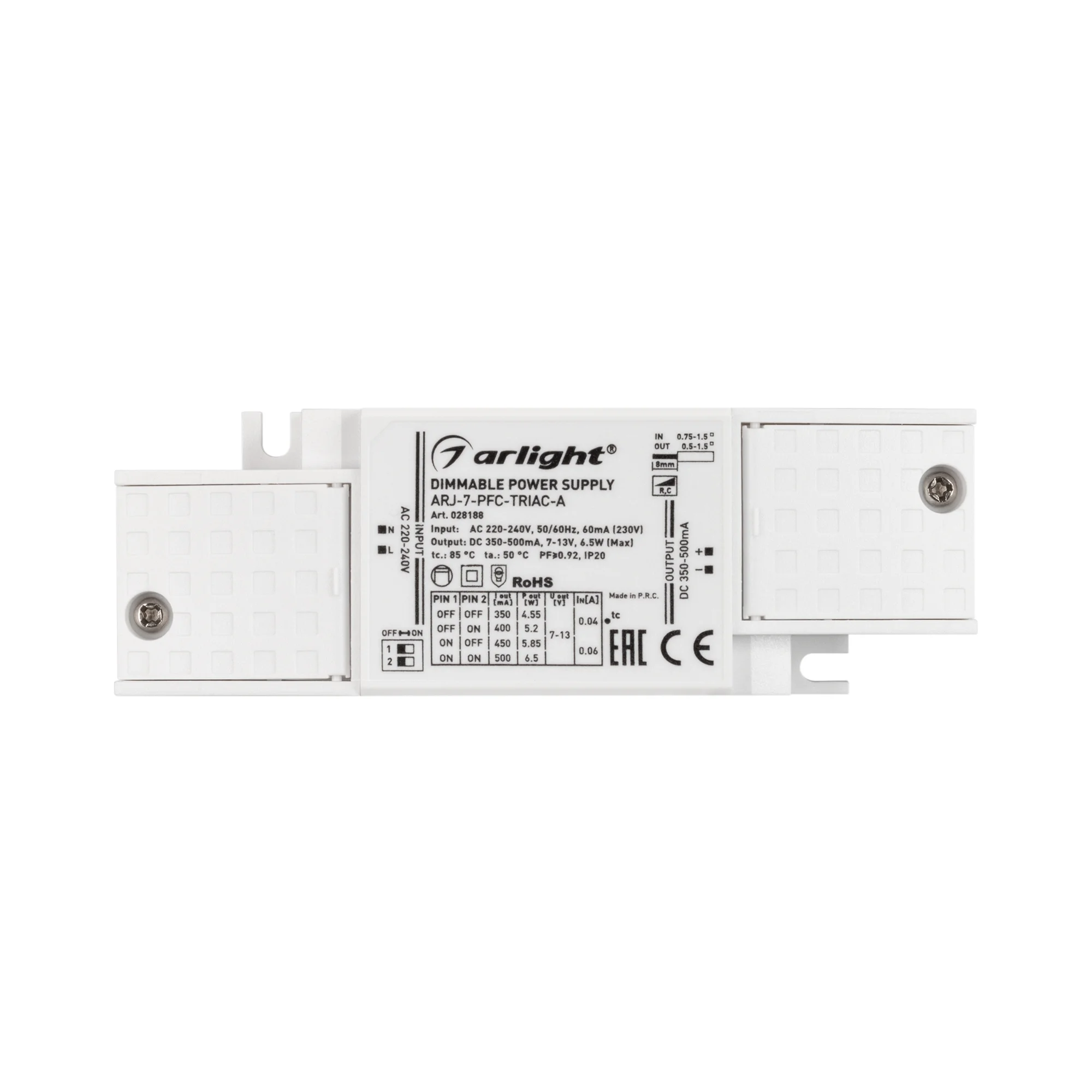 Диммируемый источник тока по стандарту TRIAC с гальванической развязкой для светильников и мощных светодиодов. Входное напряжение 220-240 VAC. Выходные параметры: 7-13В (350-500мА), максимальная мощность 6.5 Вт. Выбор значения тока осуществляется DIP-переключателем. Встроенный PFC >0,92. Негерметичный пластиковый корпус IP 20. Габаритные размеры длина 122 мм, ширина 41 мм, высота 23 мм. Гарантийный срок 5 лет.