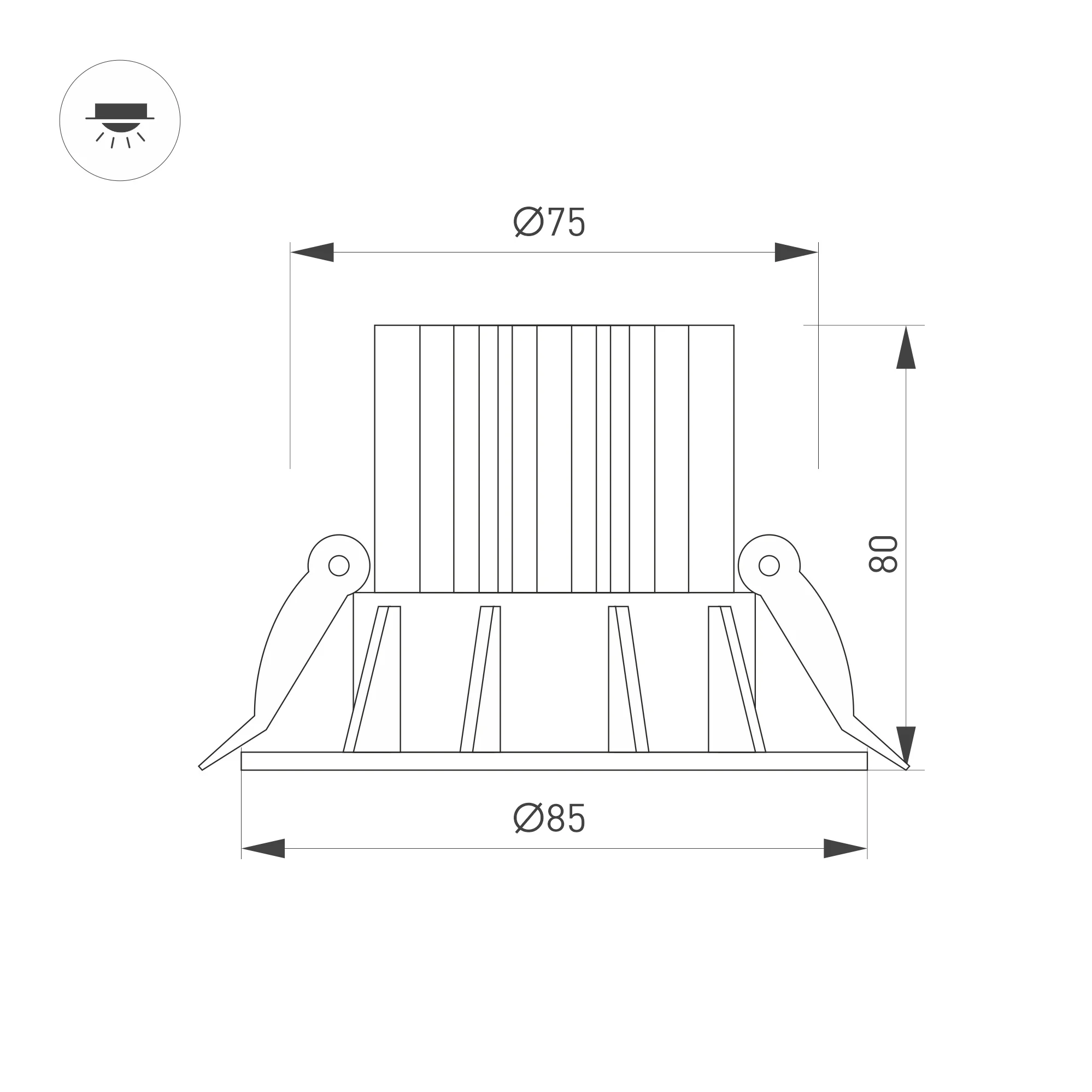 Встраиваемый светильник даунлайт. Мощность 10 Вт, св. поток 750 лм, 75 лм/Вт, теплый 3000 K, CRI>90, угол 36°, напряжение питания 230 В. Белый круглый корпус из алюминия, экран PMMA, степень защиты IP54. Размер: диаметр 86 мм, высота 80 мм. Монтаж встраиваемый, установочное отверстие: диаметр 80 мм. Драйвер IP54, 20-40 В, 250 мА, пульсация <1%.