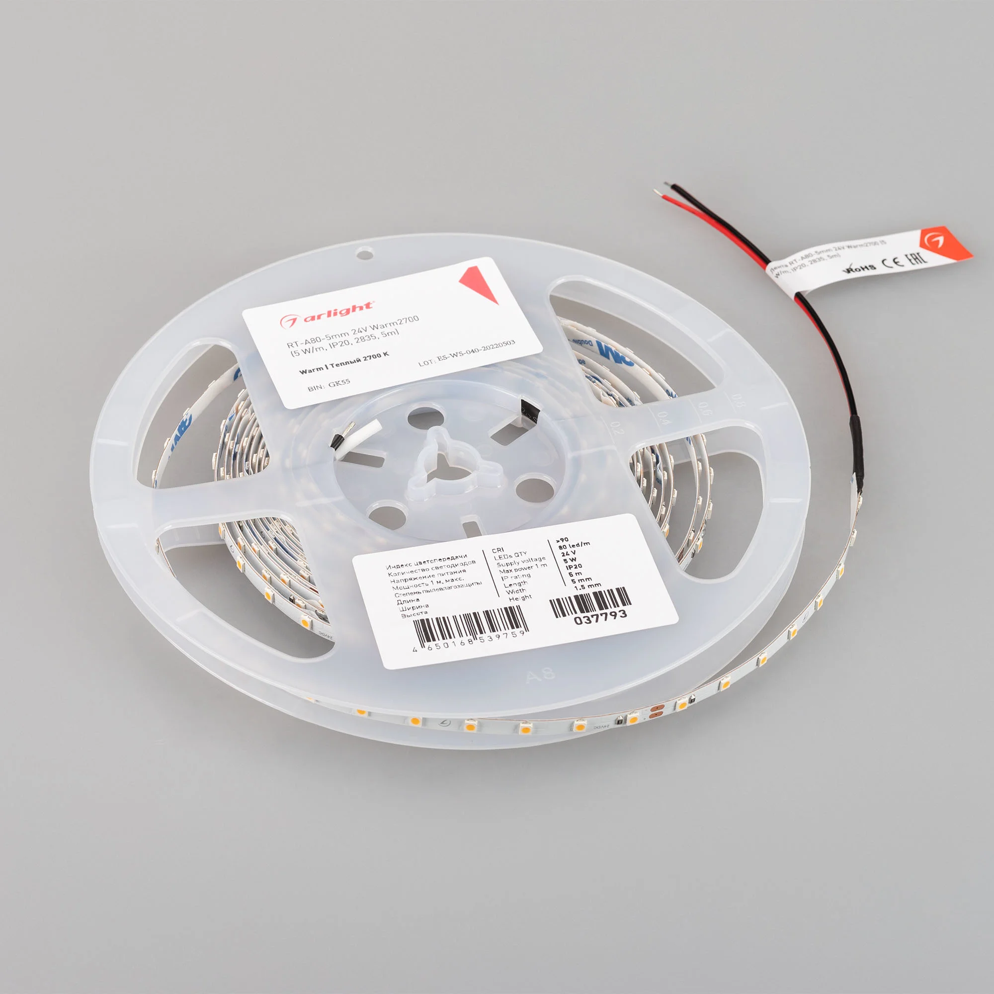 Светодиодная узкая лента RT серии A80. Светодиоды SMD 2835, 80 шт/м, белая плата шириной 5 мм, скотч 3M. Цвет ТЕПЛЫЙ 2700K, индекс цветопередачи CRI>90, угол 120°. Питание 24 В, мощность 5 Вт/м (25 Вт на 5 м). Размеры 5000х5х1.5 мм. Мин. отрезок 100 мм, 8 светодиодов. Цена за 1 м. Рекомендуется установка на профиль. Кратность […]