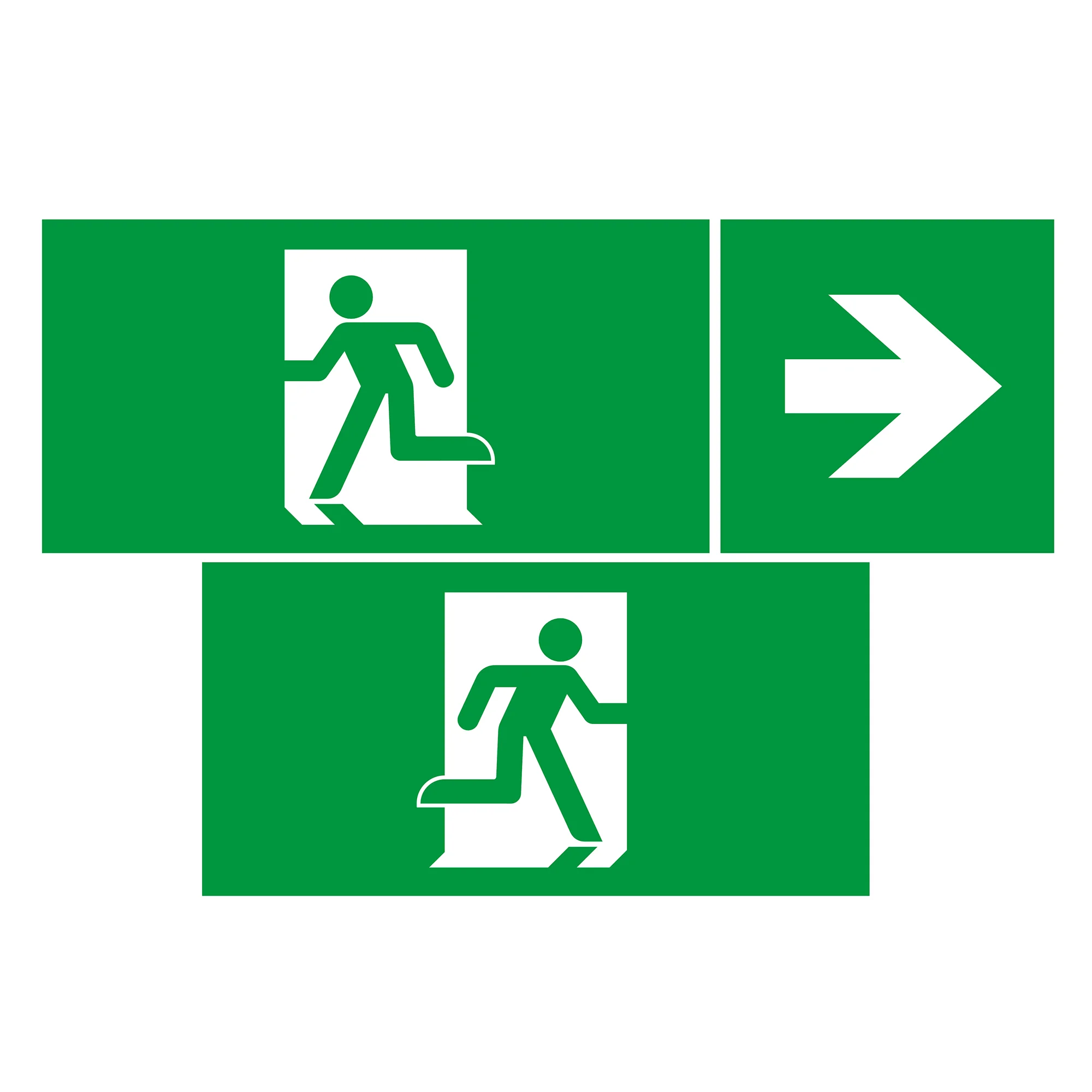 Три пиктограммы 100х100мм: «Стрелка», «Бегущий человек влево», «Бегущий человек вправо» для аварийных панелей серии EMG-PROOF. Дают возможность установки знака направления в любую сторону. Для поклейки рекомендуется соблюдать инструкцию от аварийной панели PROOF.