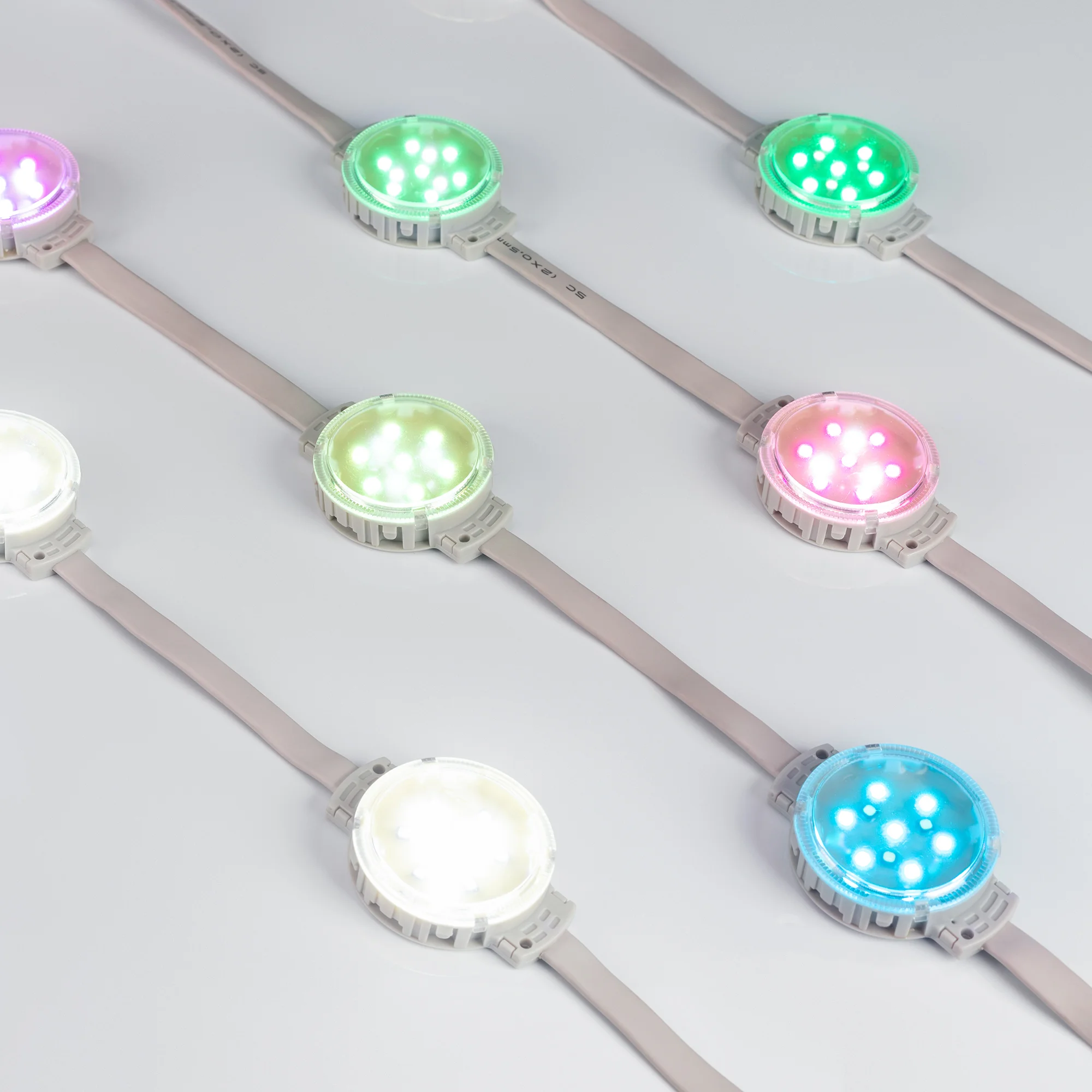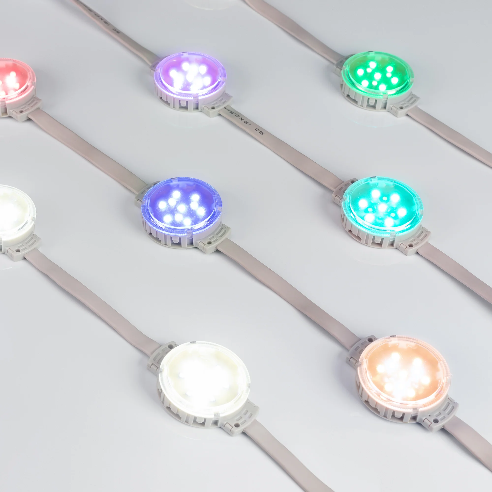 Управляемый светодиодный модуль SPI, RGB, микросхема DP1903, напряжение 12 В, мощность 0.65 Вт, 2 светодиода SMD 3535, угол излучения 360°. Создание медиафасадов, 20 шт на проводе, расстояние между центрами модулей 105 мм, длина провода между модулями 75 мм. Степень пылевлагозащиты IP66. Размер Ø11×28 мм. Гарантия 3 года. Кратность заказа поставщику: 100 шт.