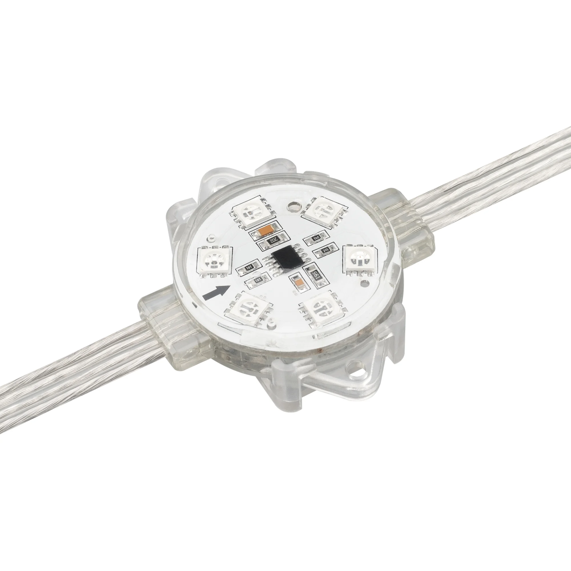 Управляемый светодиодный модуль SPI, RGB, микросхема МТ26803 (аналог UCS1903), напряжение 24 В, мощность 1.25 Вт, 6 светодиодов SMD 3535, угол 120°. Создание медиафасадов, 30 шт на проводе, расстояние между центрами модулей 170 мм, длина провода между модулями 110 мм. Степень пылевлагозащиты IP68. Размер Ø40×16 мм. Гарантия 3 года. Кратность заказа поставщику: 60 шт.