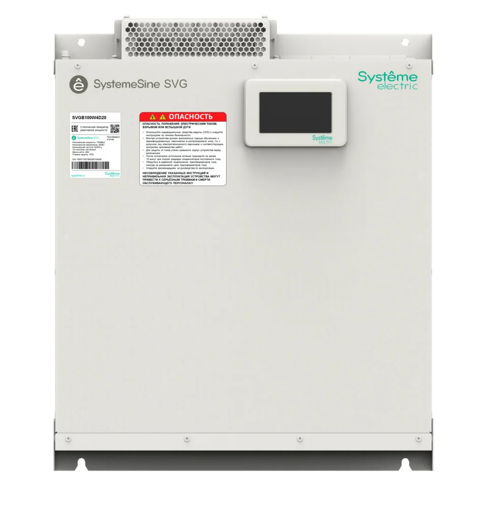 Статический генератор реактивной мощности торговой марки Systeme Electric серии SystemeSine типа SVG, номинальная мощность 100кВАр, номинальное напряжение 400В, степень защиты IP20, навесной модуль с встроенным 4,3 дюймовым ЖК дисплеем