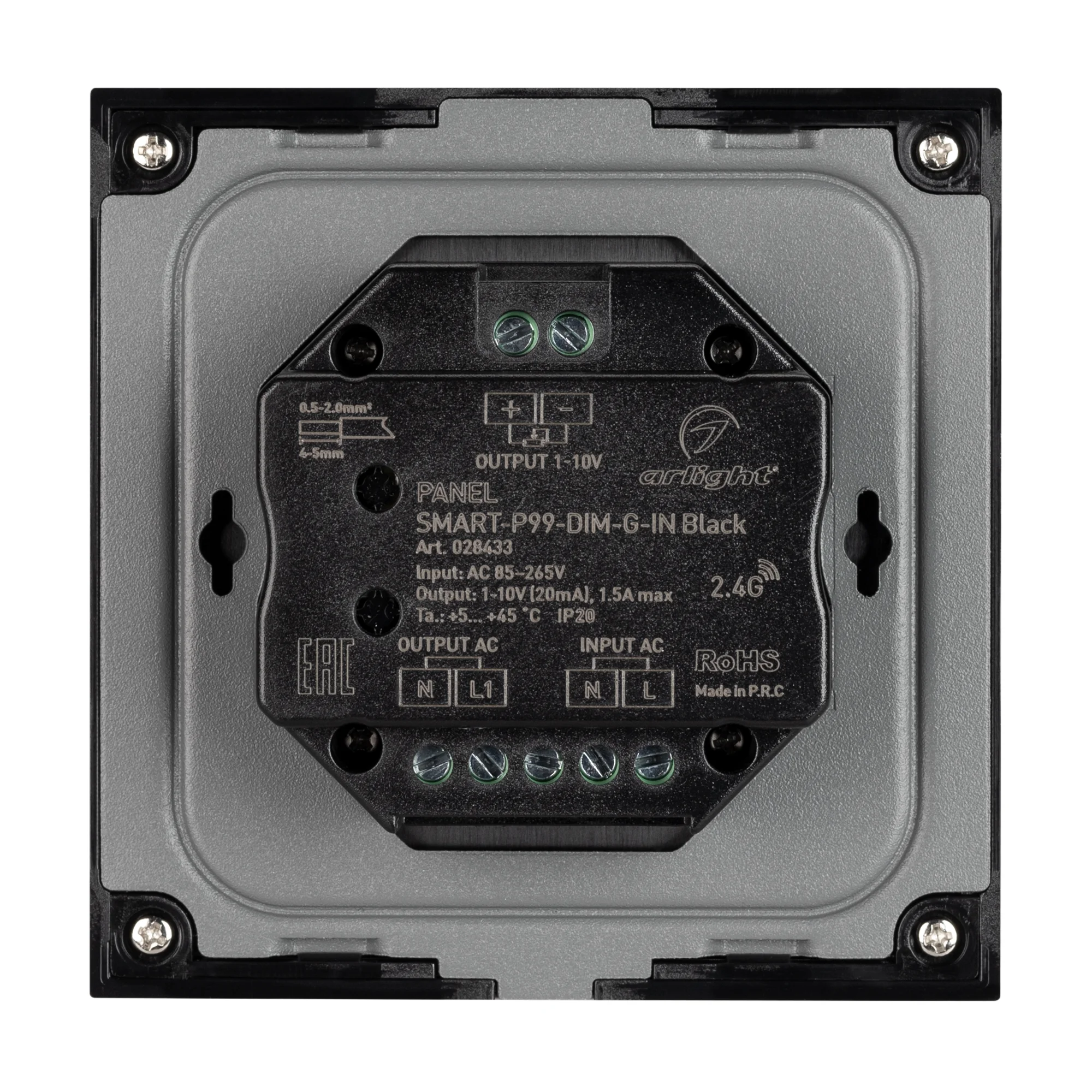 Встраиваемая роторная панель RF 2.4 ГГц, цвет чёрный. Материал — стекло. Выходной сигнал 0/1-10V. Управление яркостью с помощью роторного вращателя. Работает в режиме master/slave, 1 зона. Питание 230V, входное напряжение 100-240VAC. Габариты 86х86х35 мм. Панель совместима с 0/1-10V (dip-переключатель) контроллерами и пультами серии SMART.