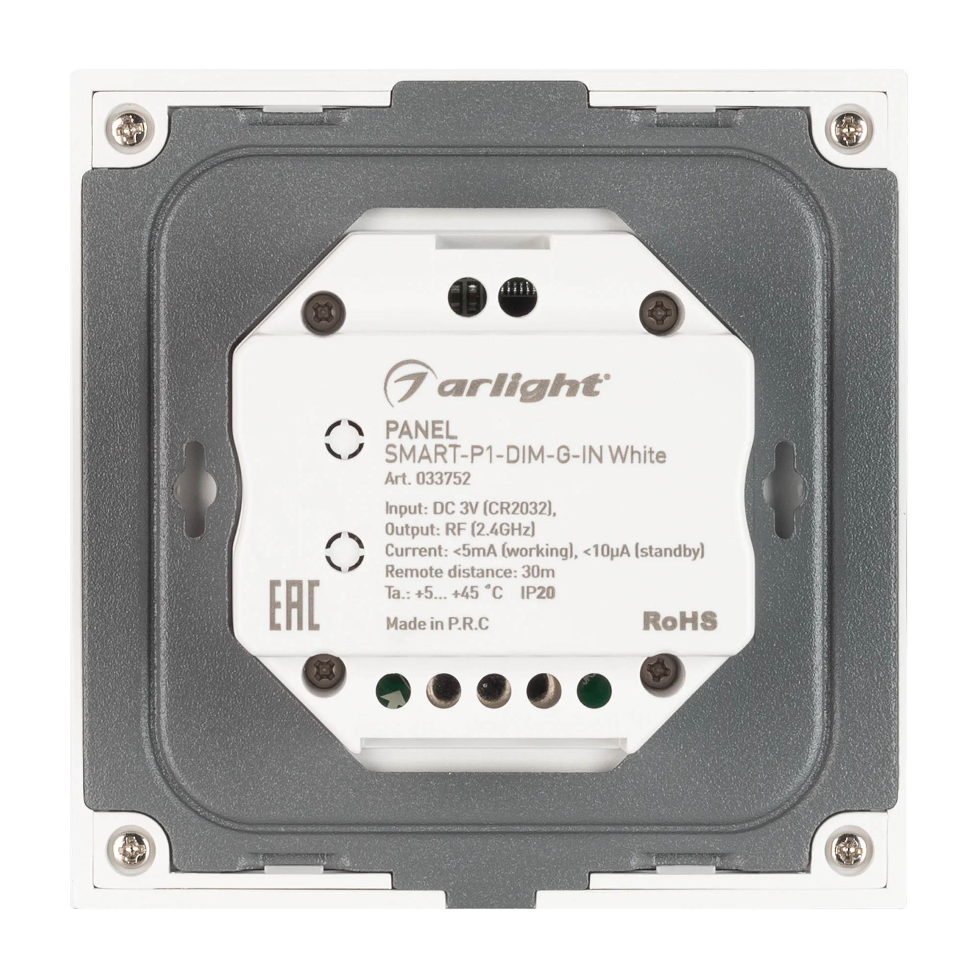 Встраиваемая роторная панель 2.4 ГГц, цвет белый. Материал — стекло/пластик. Для управления одноцветными источниками света (ШИМ). Управление яркостью с помощью роторного вращателя. Питание/рабочее напряжение 3VDC от батарейки CR2032. Габариты 86х86х48 мм. Предназначена для установки в стандартный подрозетник. Панель совместима с диммерами серии SMART.