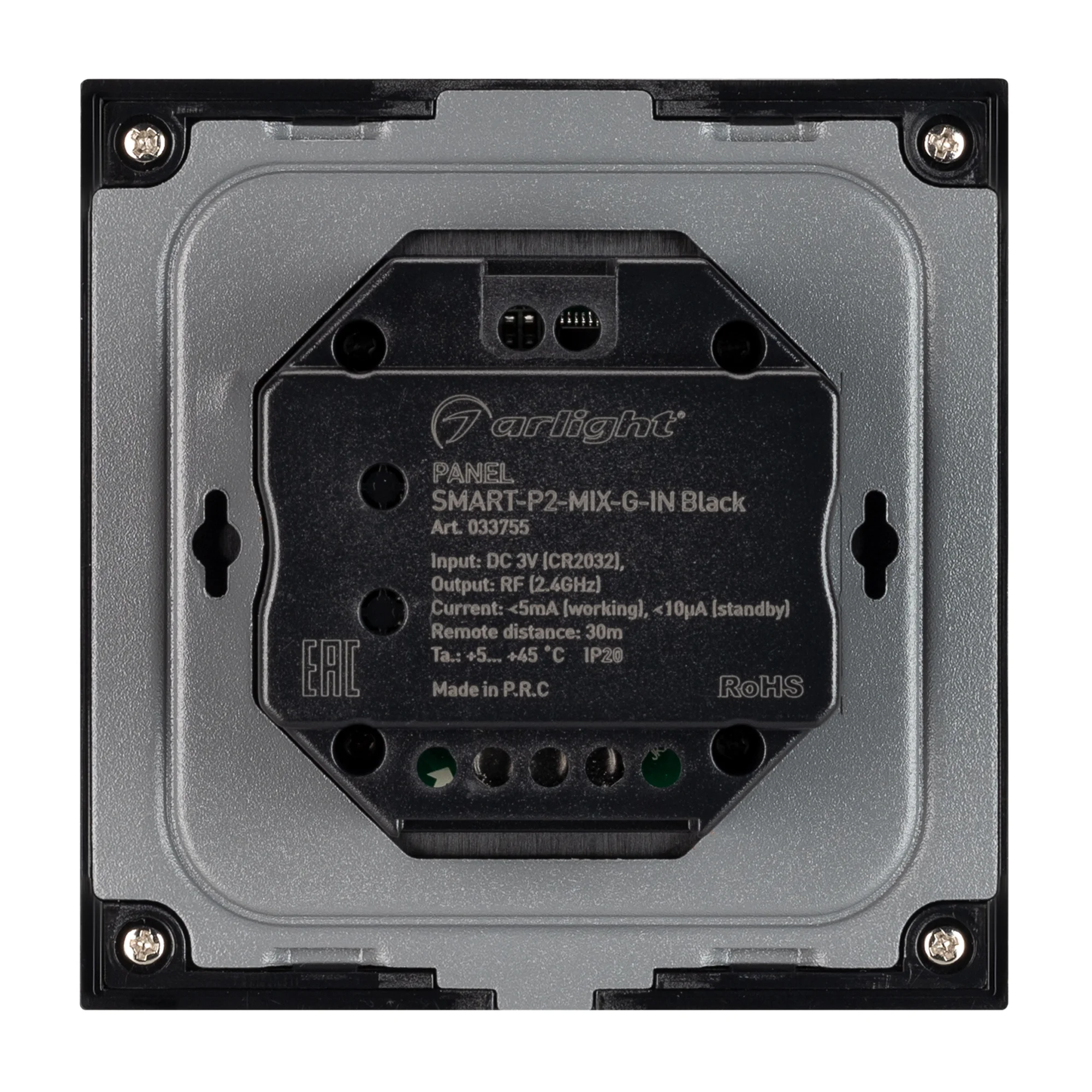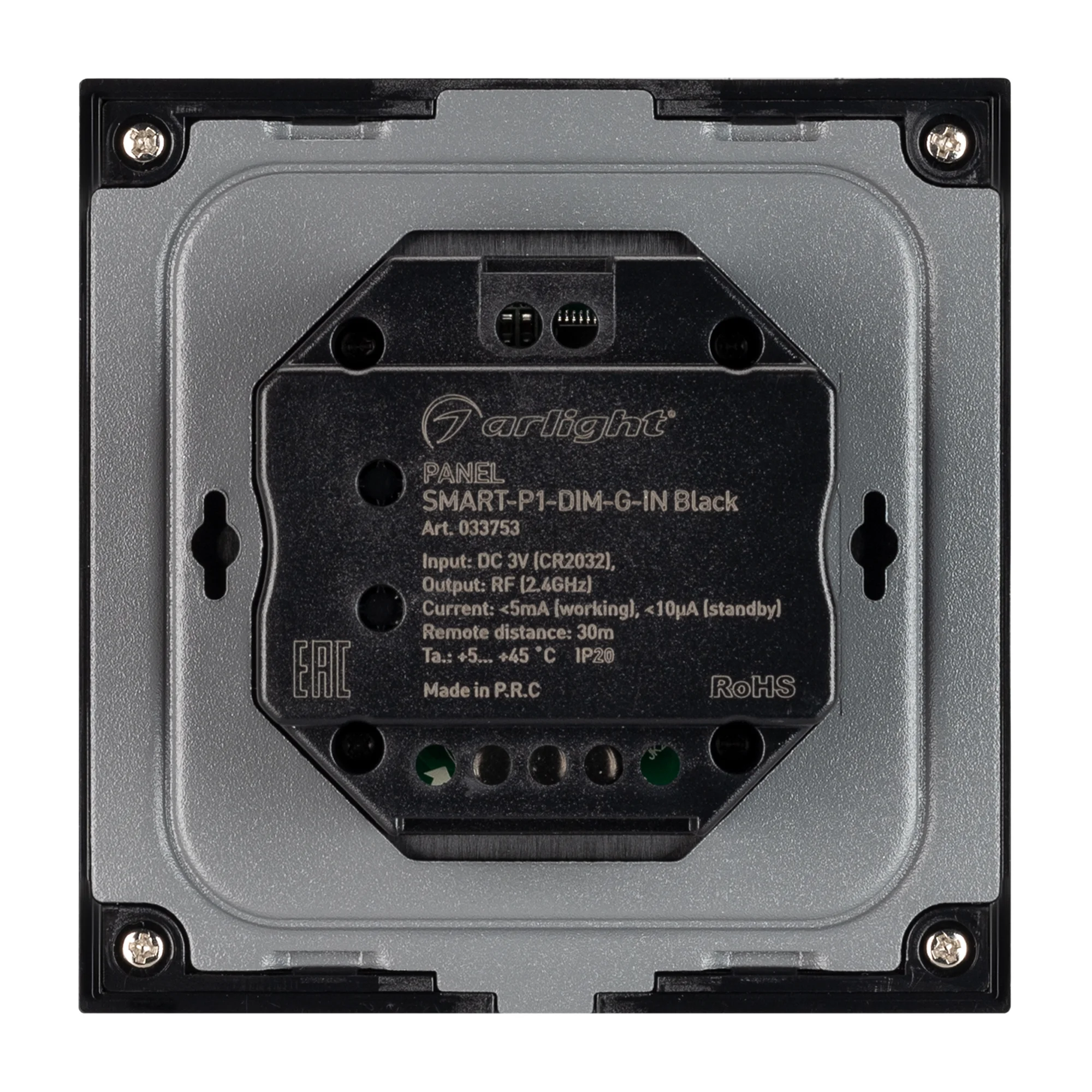 Встраиваемая роторная панель 2.4 ГГц, цвет чёрный. Материал — стекло/пластик. Для управления мультибелыми источниками света (ШИМ). Управление яркостью с помощью роторного вращателя. Питание/рабочее напряжение 3VDC от батарейки CR2032. Габариты 86х86х48 мм. Предназначена для установки в стандартный подрозетник. Панель совместима с контроллерами серии SMART.