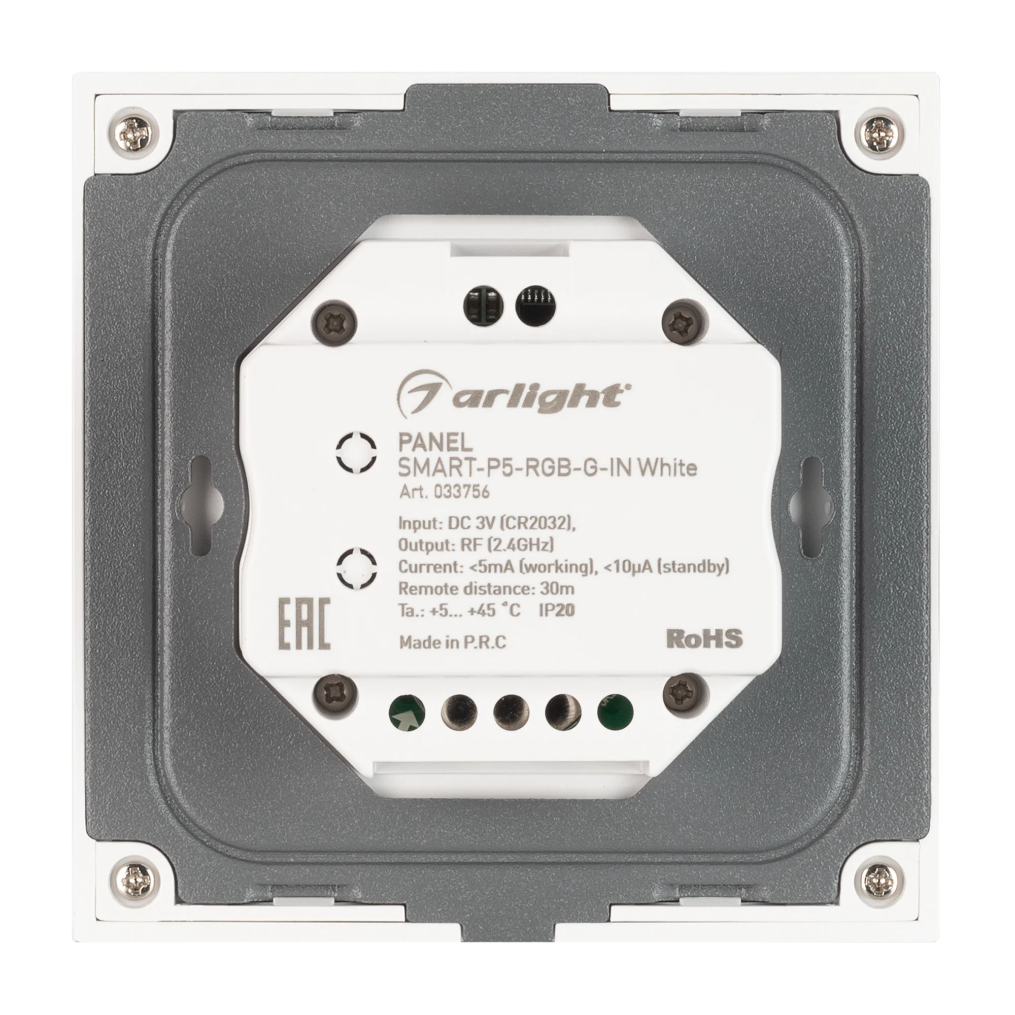 Встраиваемая роторная панель 2.4 ГГц, цвет белый. Материал — стекло/пластик. Для управления RGB источниками света (ШИМ). Управление яркостью с помощью роторного вращателя. Питание/рабочее напряжение 3VDC от батарейки CR2032. Габариты 86х86х48 мм. Предназначена для установки в стандартный подрозетник. Панель совместима с контроллерами серии SMART.