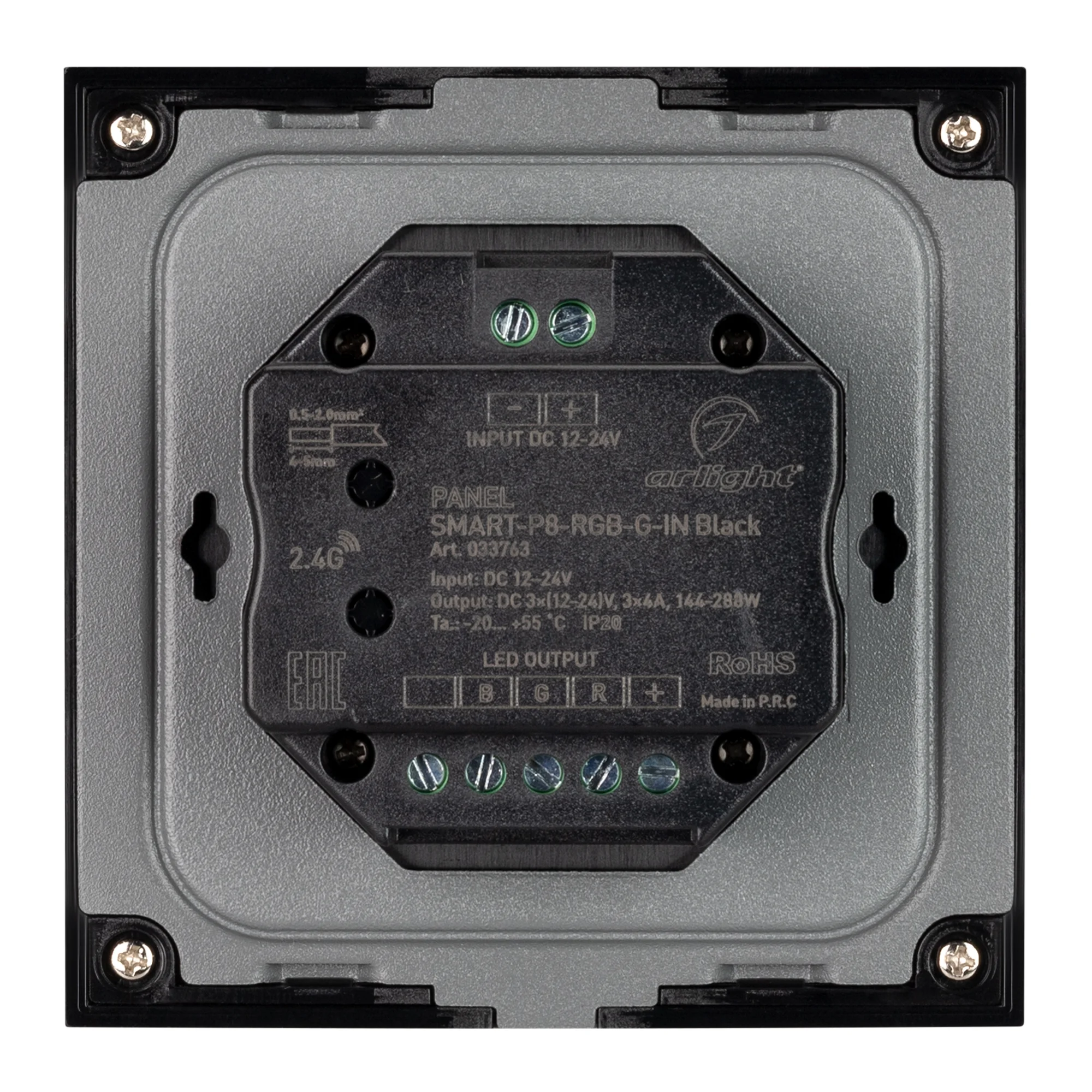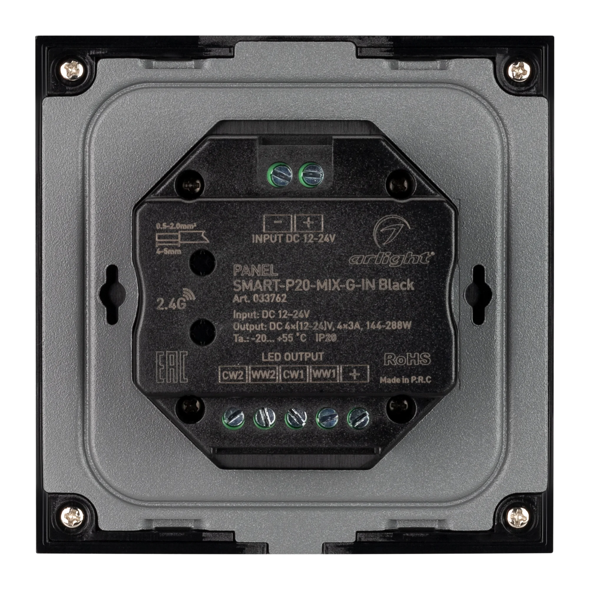 Встраиваемая роторная стеклянная панель 2.4 ГГц, цвет чёрный. Для управления одноцветными источниками света (ШИМ). Управление яркостью с помощью роторного регулятора. Работает в режиме master/slave и может выполнять функцию независимого контроллера. Питание/рабочее напряжение 12-24VDC, 4 параллельных выхода по 4А максимальной нагрузки на канал, максимальная суммарная мощность 144-288W. Габариты 86х86х50 мм. Панель совместима с диммерами серии SMART. […]