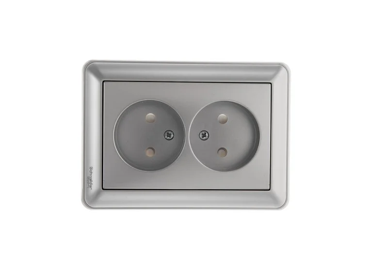 Розетка Systeme Electric (ранее Schneider Electric) W59 (в сборе, цвет матовый хром) двойная без заземления со шторками подходит для сетей 250 В, на ток 16 А. — Контакты розеток выполнены из латуни с высоким содержанием меди. — Шторки обеспечивают дополнительную безопасность в доме, где находятся дети. — Корпус изделия выполнен из высококачественного ABS-пластика.