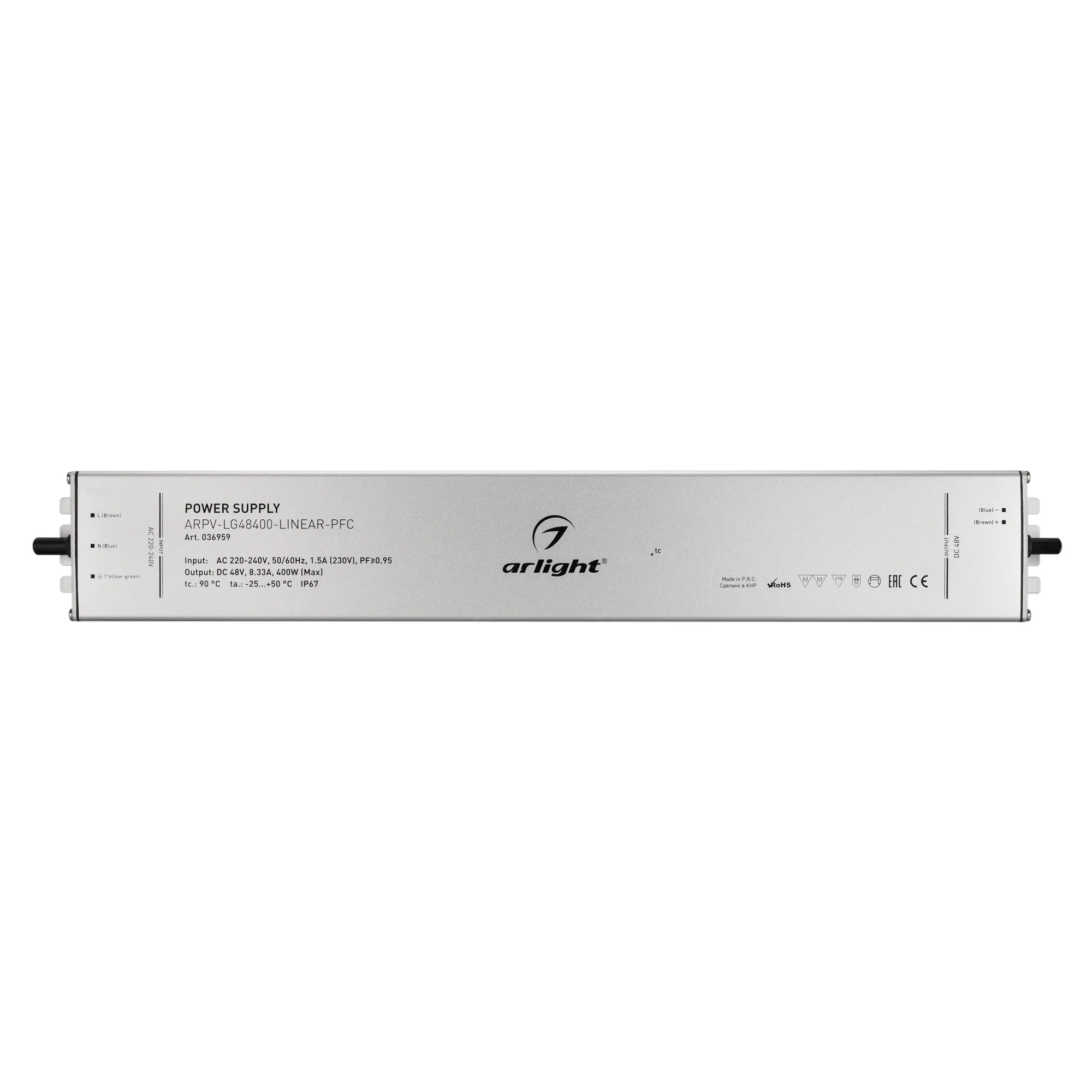 Источник напряжения с гальванической развязкой для светодиодных изделий. Входное напряжение 220-240 VAC. Выходные параметры: 48 В, 8.33 А, 400 Вт. Встроенный PFC >0.95. Тонкий металлический корпус IP67. Вход: 220-240VAC. Выход: 48VDC. Размер 400х60х22 mm.. Совместимость со стандартом EMC. Гарантия 5 лет. Допускается использование только внутри помещений.