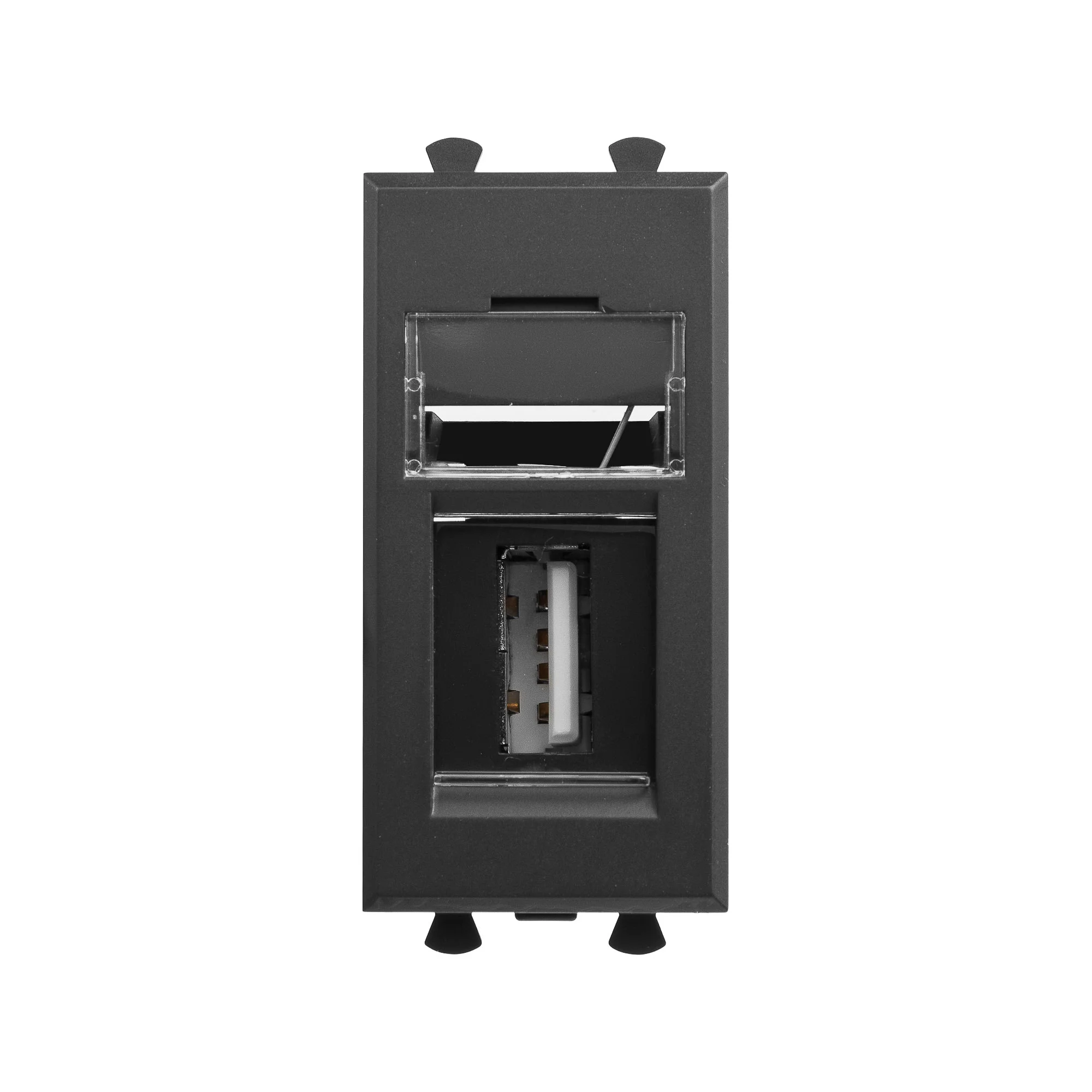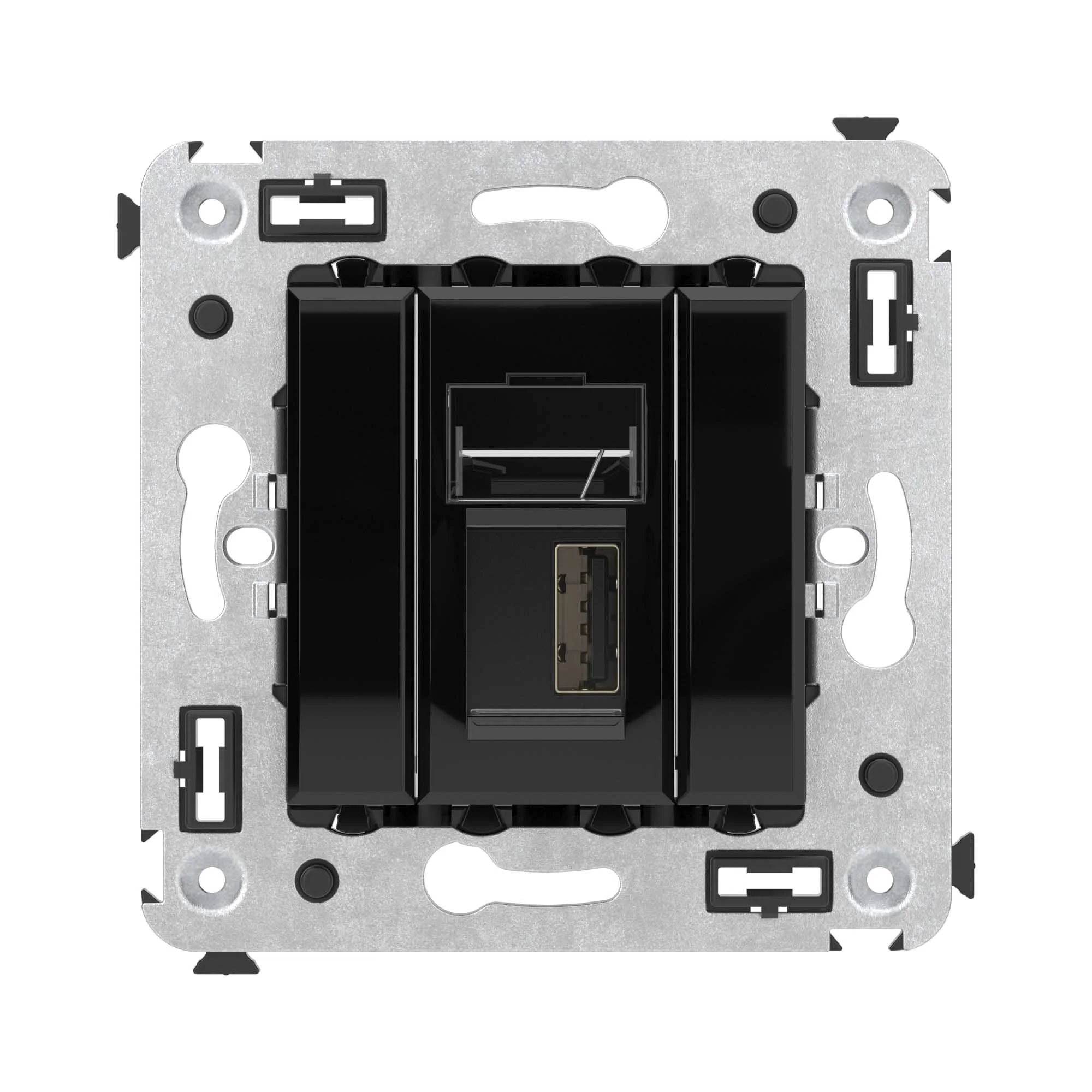 USB 2.0 розетка. Назначение: для монтажа в подрозеточные коробки глубиной не менее 45 мм (код 59301). Используется в качестве информационной розетки для передачи сигнала (подключение проекторов, мониторов и др.). Цвет: «Черный квадрат». Производитель оставляет за собой право вносить во внешний вид изделия изменения, которые не влияют на его функционал, безопасность и надежность.