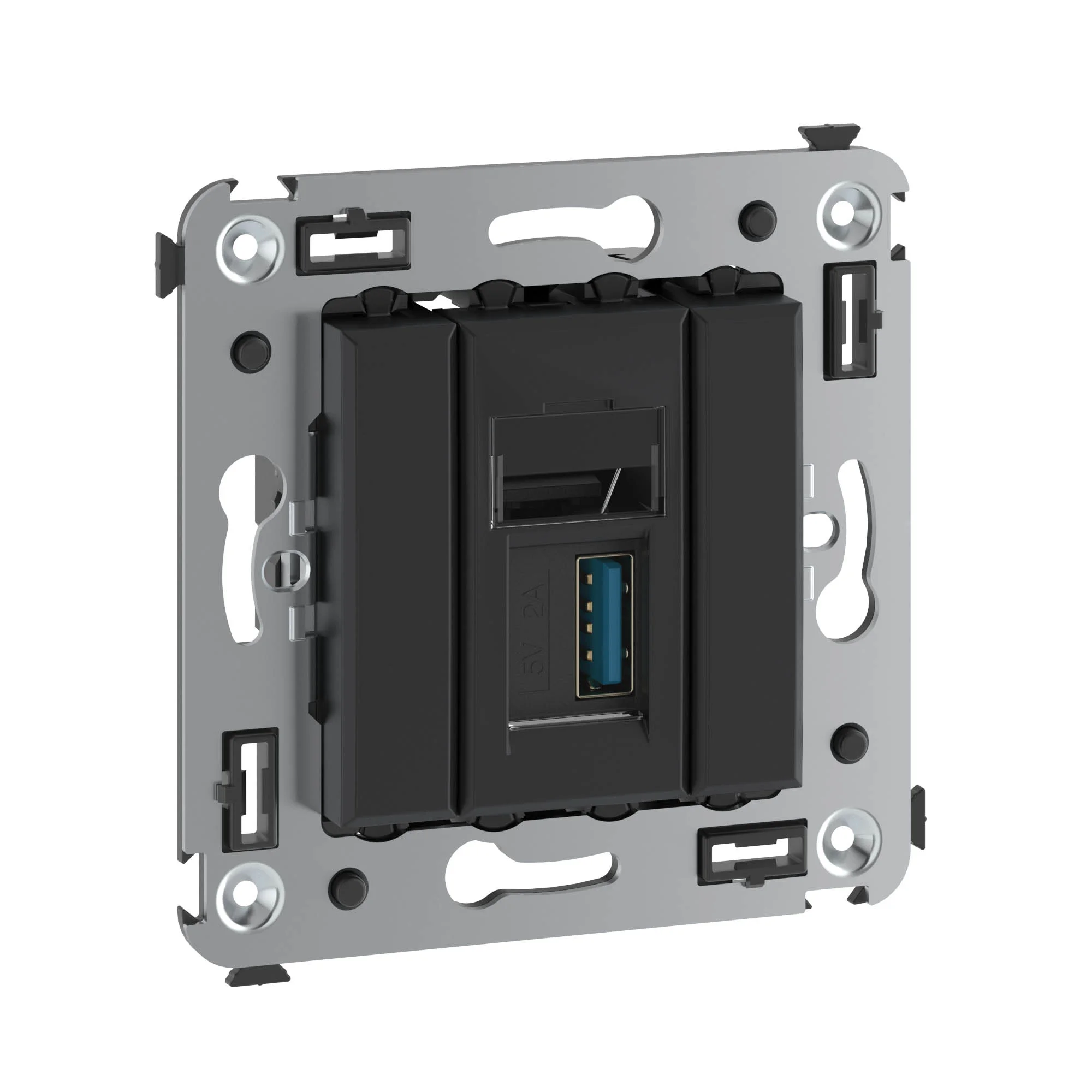 USB 3.0 розетка. Назначение: для монтажа в подрозеточные коробки глубиной не менее 45 мм (код 59301). Используется в качестве информационной розетки для передачи сигнала (подключение проекторов, мониторов и др.). 2 модуля. Цвет: «Черный матовый». Производитель оставляет за собой право вносить во внешний вид изделия изменения, которые не влияют на его функционал, безопасность и надежность.