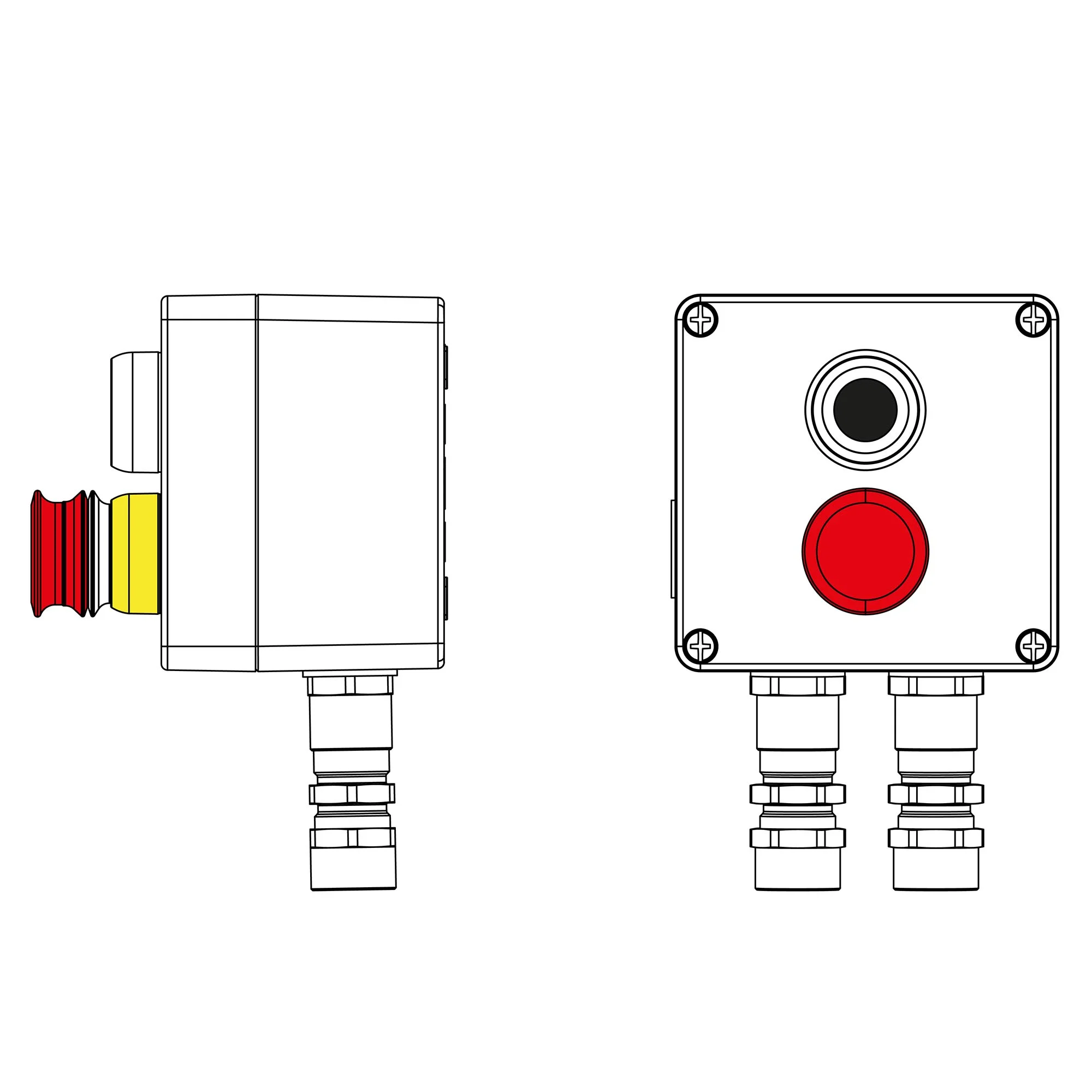 Кнопочный пост шириной 80 мм, высотой 150 мм и глубиной 72 мм, в котором толкателем выступает черная и красная кнопка .