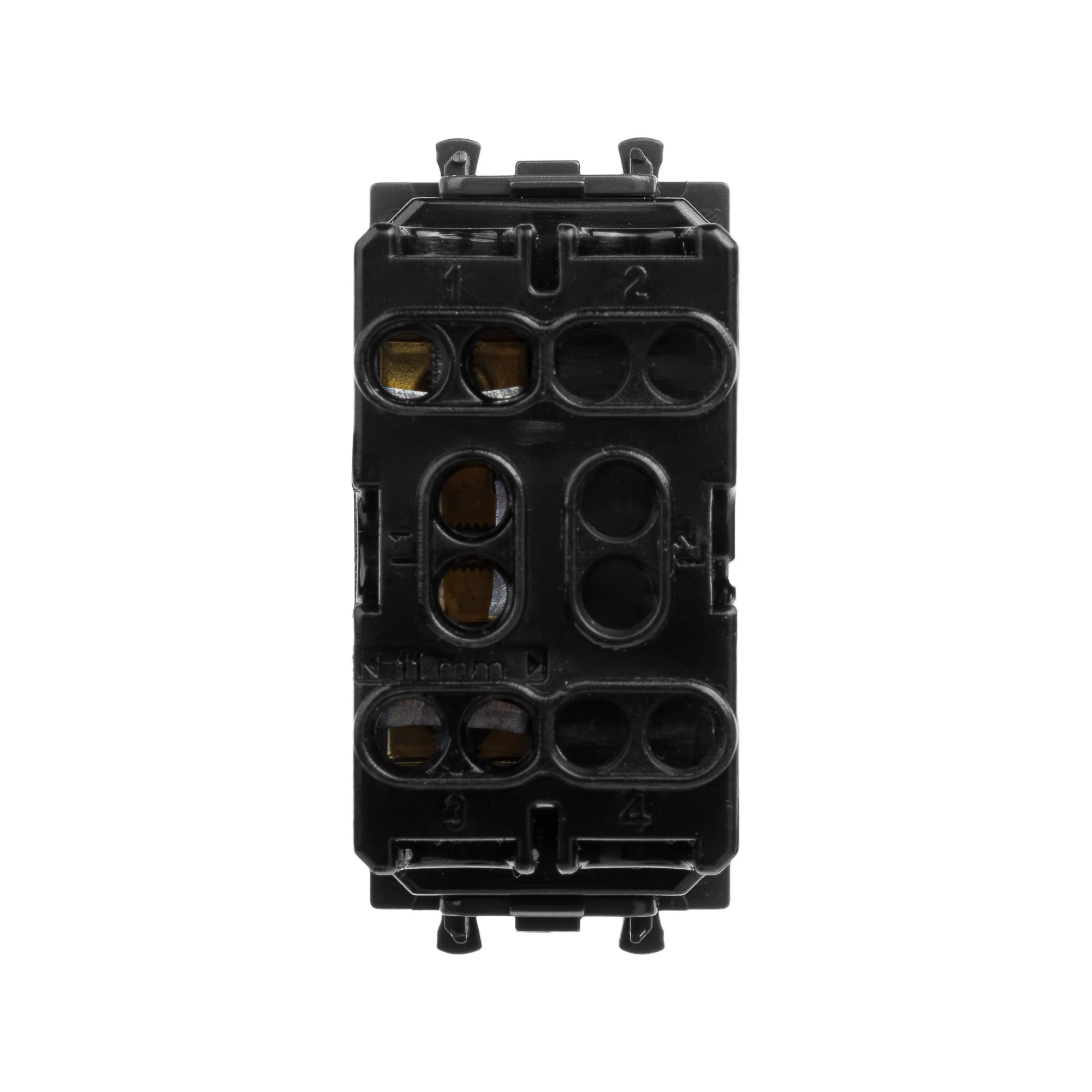 Инвертор (промежуточный или перекрестный переключатель). Назначение: включение/выключение освещения. Устанавливается в цепь между двумя переключателями (проходными) в коридорах и т. п. Характеристики: номинальный ток − 16 А; номинальное напряжение − 250 B. Кол-во модулей: 1. Цвет: белый