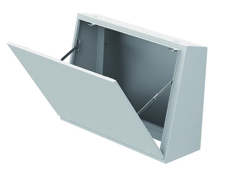 Используется для комбинирования пультов управления.Монтируется на среднюю часть пульта.На двери и внутри корпуса предусмотрены заземляющие соединения.Дверь оборудована перфорированными рейками и упорами.