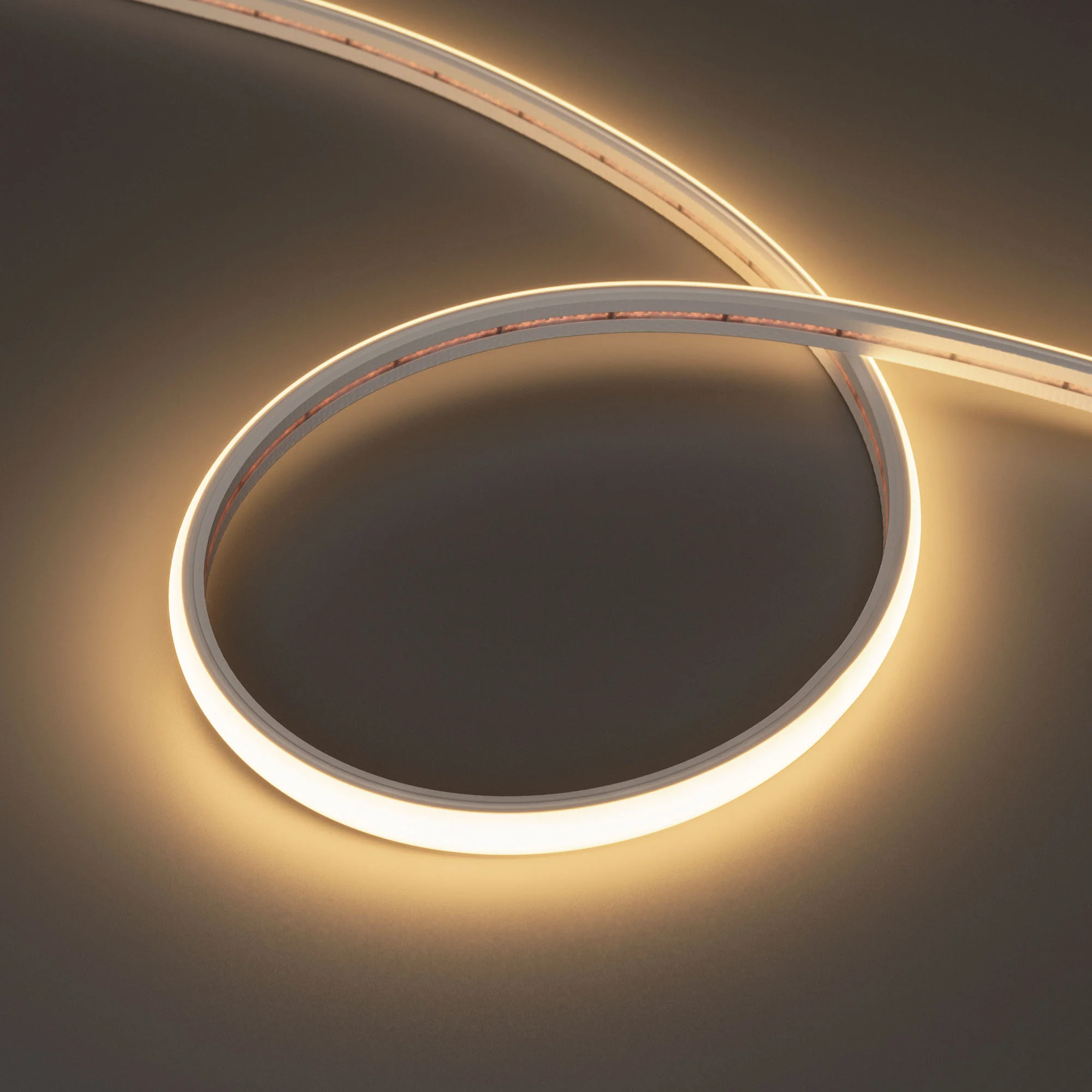 Светодиодная лента сплошного свечения COB серии X320. Светодиоды CSP, 320 шт/м, белая плата шириной 8 мм, скотч 3M. Цвет ТЕПЛЫЙ 2700K, индекс цветопередачи CRI>90, угол 175°. Питание 24 В, мощность 8 Вт/м (40 Вт на 5 м). Размеры 5000х8х2 мм. Мин. отрезок 50 мм. Цена за 1 м. Кратность заказа поставщику: 5 м.