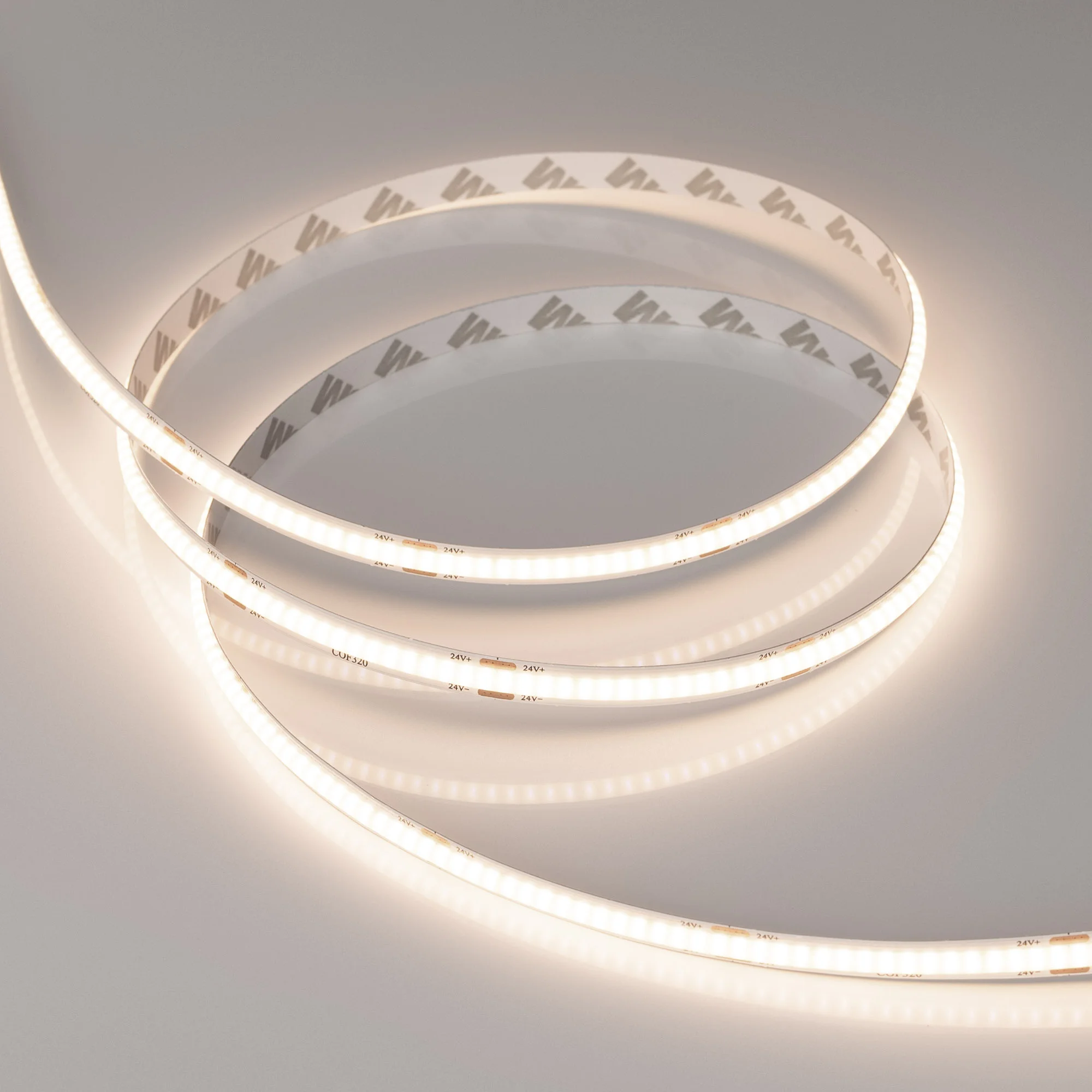 Светодиодная лента сплошного свечения COB серии X320. Светодиоды CSP, 320 шт/м, белая плата шириной 8 мм, скотч 3M. Цвет ТЕПЛЫЙ 3500K, индекс цветопередачи CRI>90, угол 175°. Питание 24 В, мощность 8 Вт/м (40 Вт на 5 м). Размеры 5000х8х2 мм. Мин. отрезок 50 мм. Цена за 1 м. Кратность заказа поставщику: 5 м.
