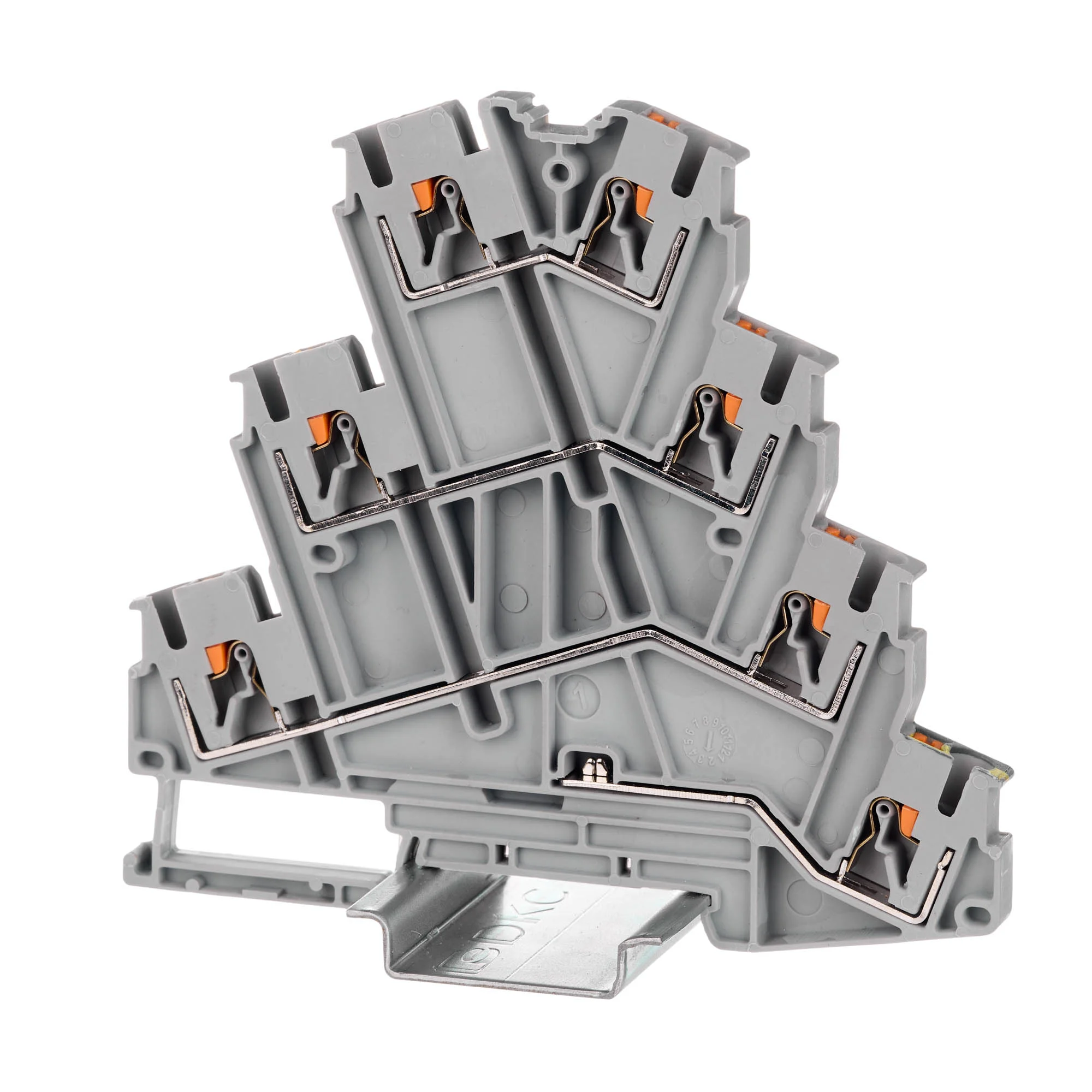 Клемма двухуровневая с винтовым зажимом предназначена для соединения четырех проводников. Монтаж на DIN-рейку OMEGA. Температура эксплуатации от -40 до +105°C. Корпус выполнен из ПА 6.6 с классом горючести V0 UL-94. Серый цвет, 4 точки подключения, 4 мм². 2 канала для вставных перемычек на каждом уровне. Габариты (В×Ш×Г) 66×73,5×6,2 мм.