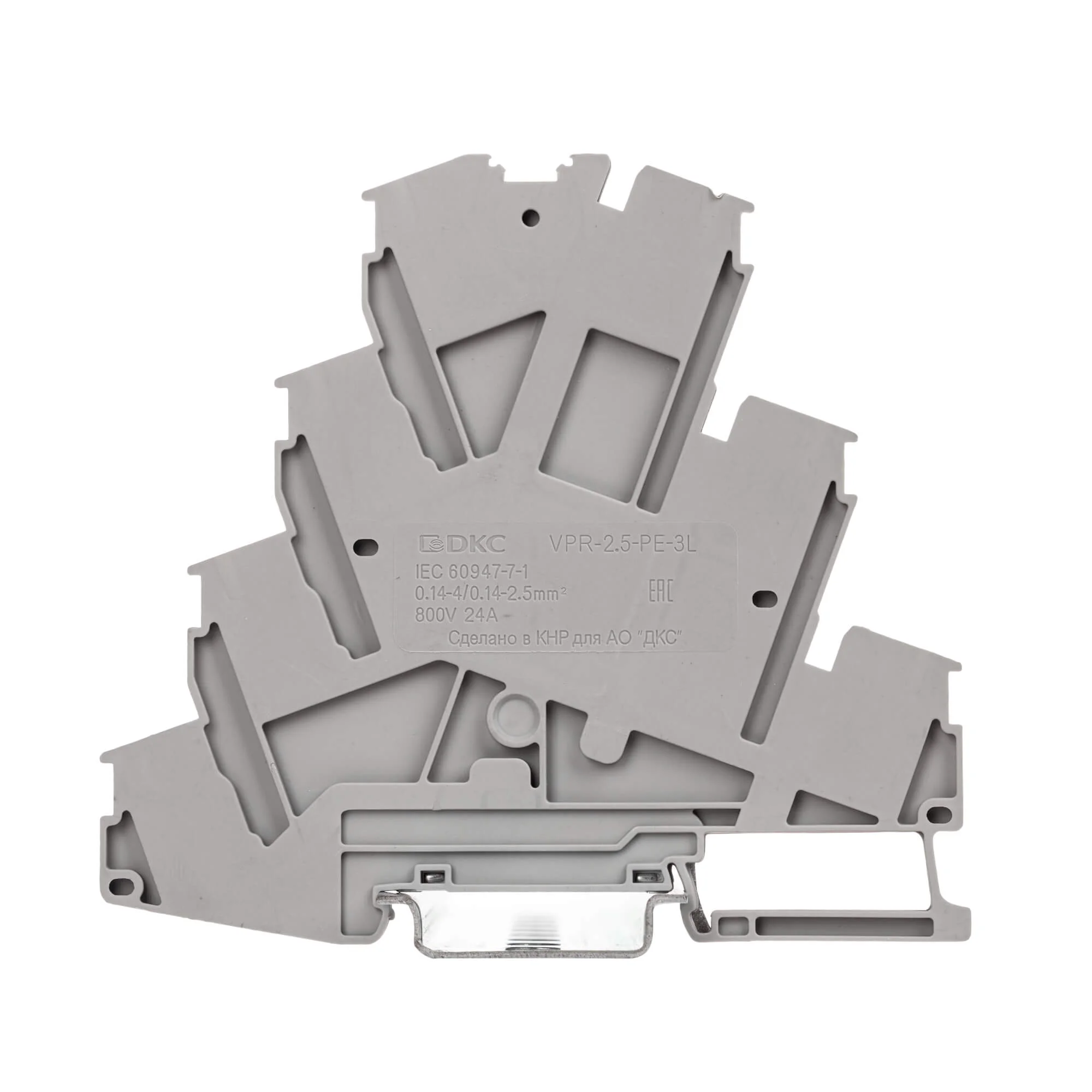 Клемма двухуровневая с винтовым зажимом предназначена для соединения четырех проводников. Монтаж на DIN-рейку OMEGA. Температура эксплуатации от -40 до +105°C. Корпус выполнен из ПА 6.6 с классом горючести V0 UL-94. Серый цвет, 4 точки подключения, 2.5 мм². 1 канал винтовых перемычек. Габариты (В×Ш×Г) 62×56×5,2 мм.