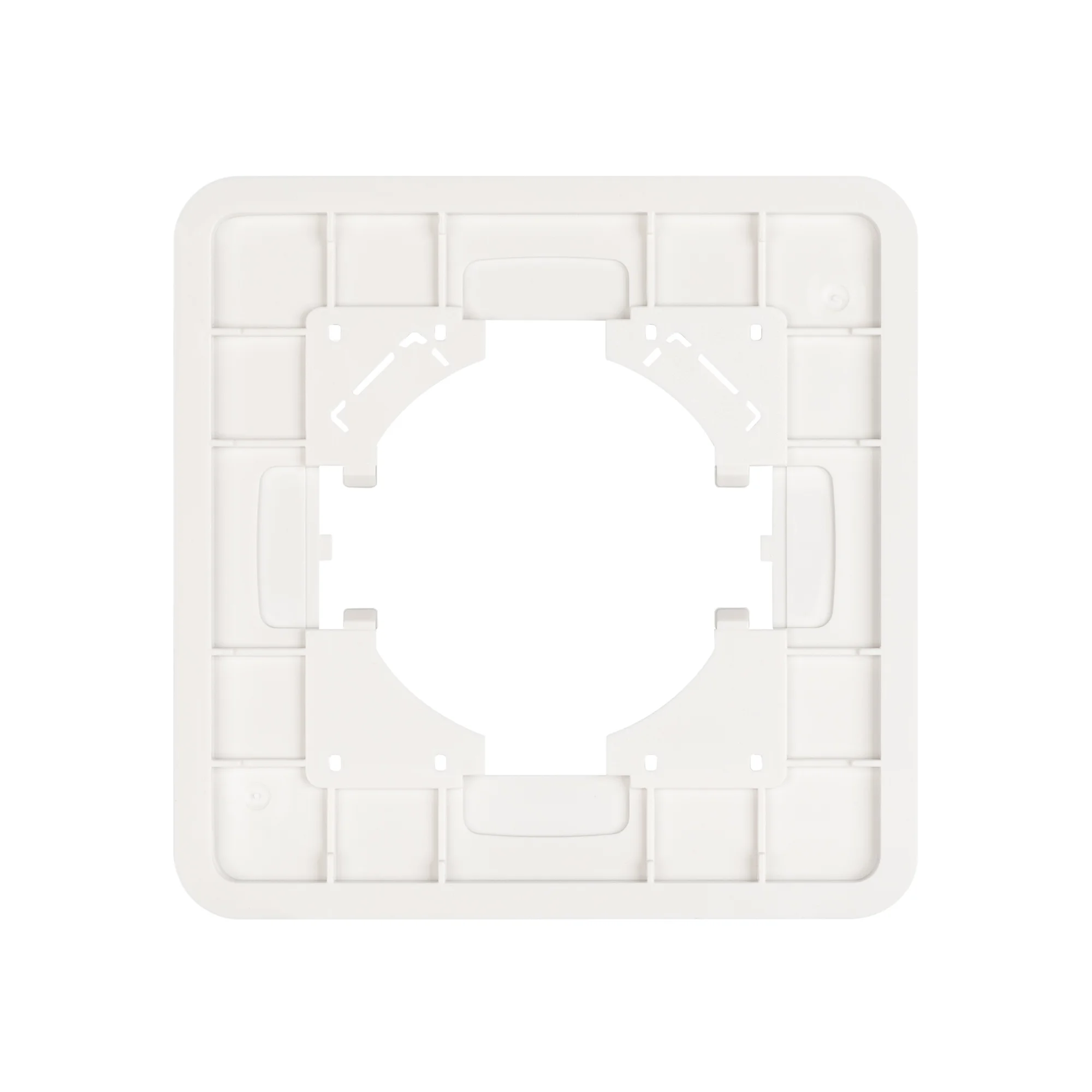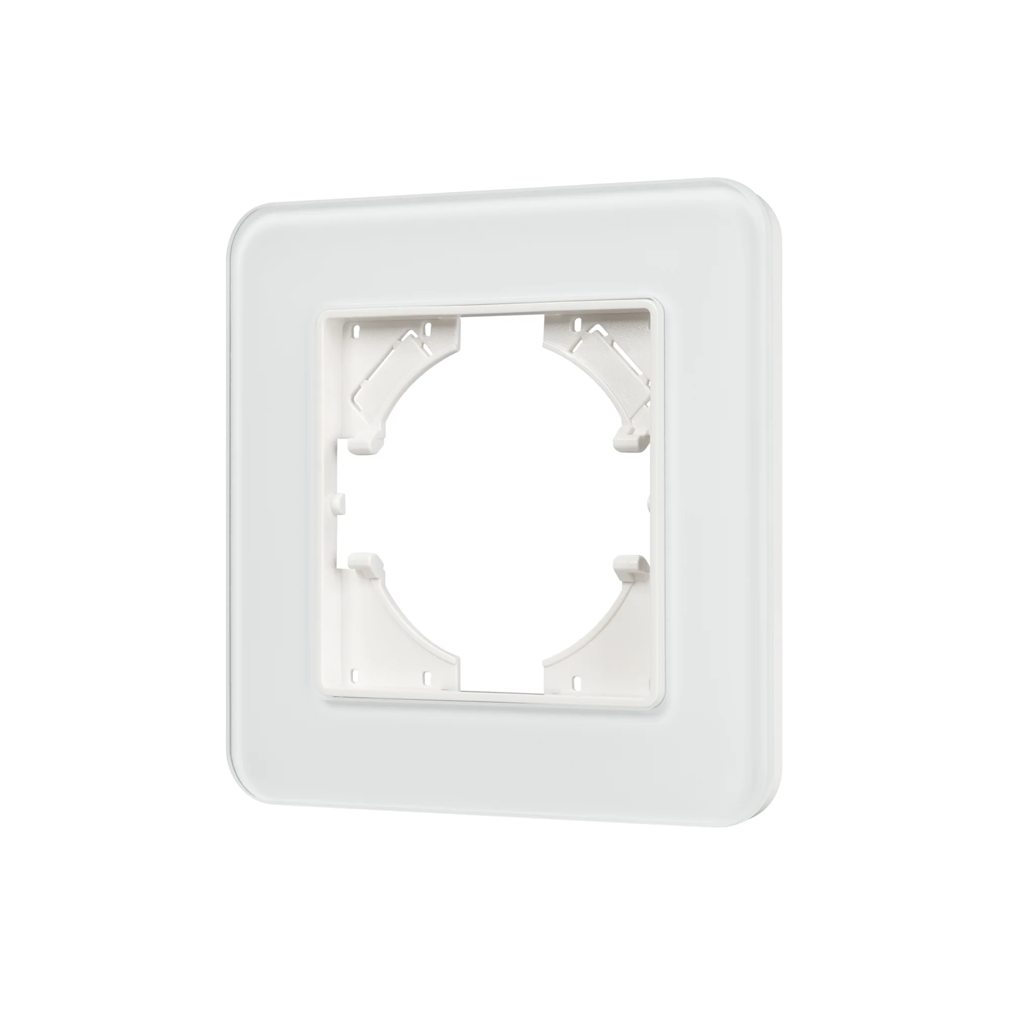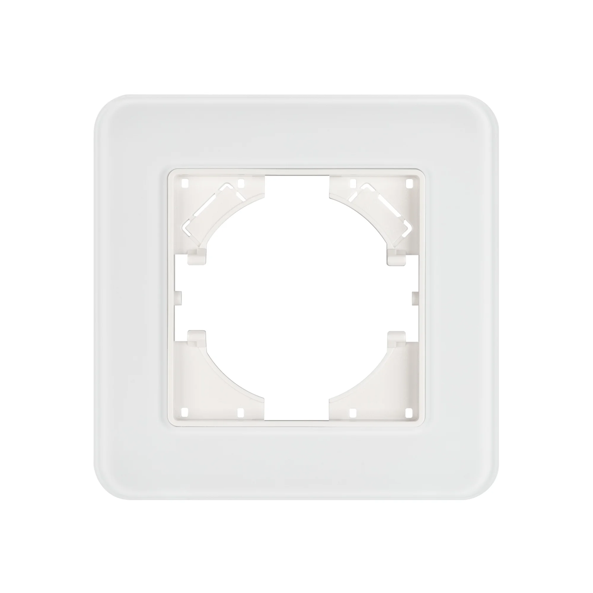 Рамка стеклянная на 1 пост, под встраиваемый механизм. Цвет — белый с Soft-Touch покрытием. Среднего уровня герметичности IP20. Ориентация монтажа — горизонтальная (основным ориентиром служат посадочные выступы для накладки механизма). Габаритные размеры: длина 86 мм, ширина 86 мм, высота 7 мм. Гарантийный срок 12 мес.