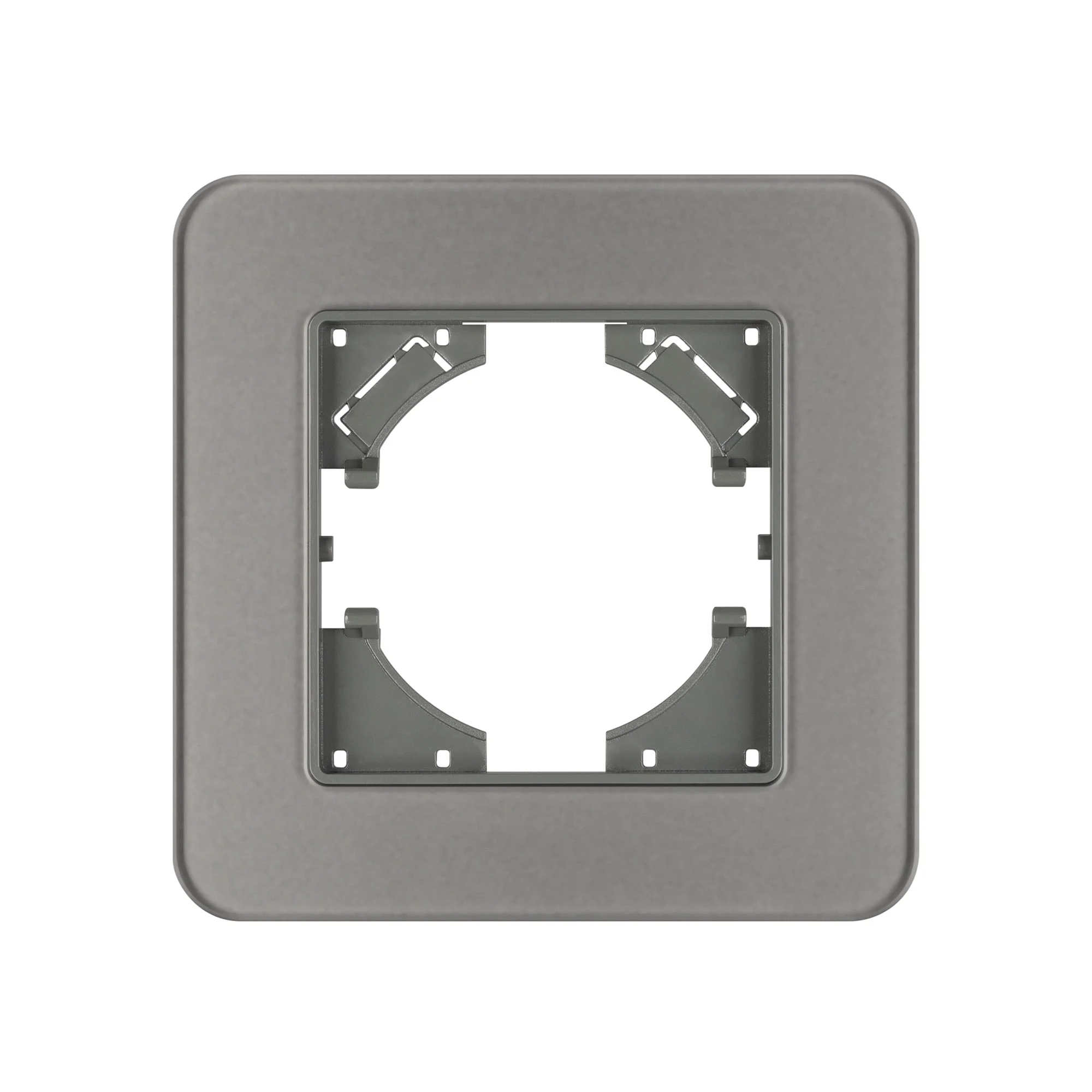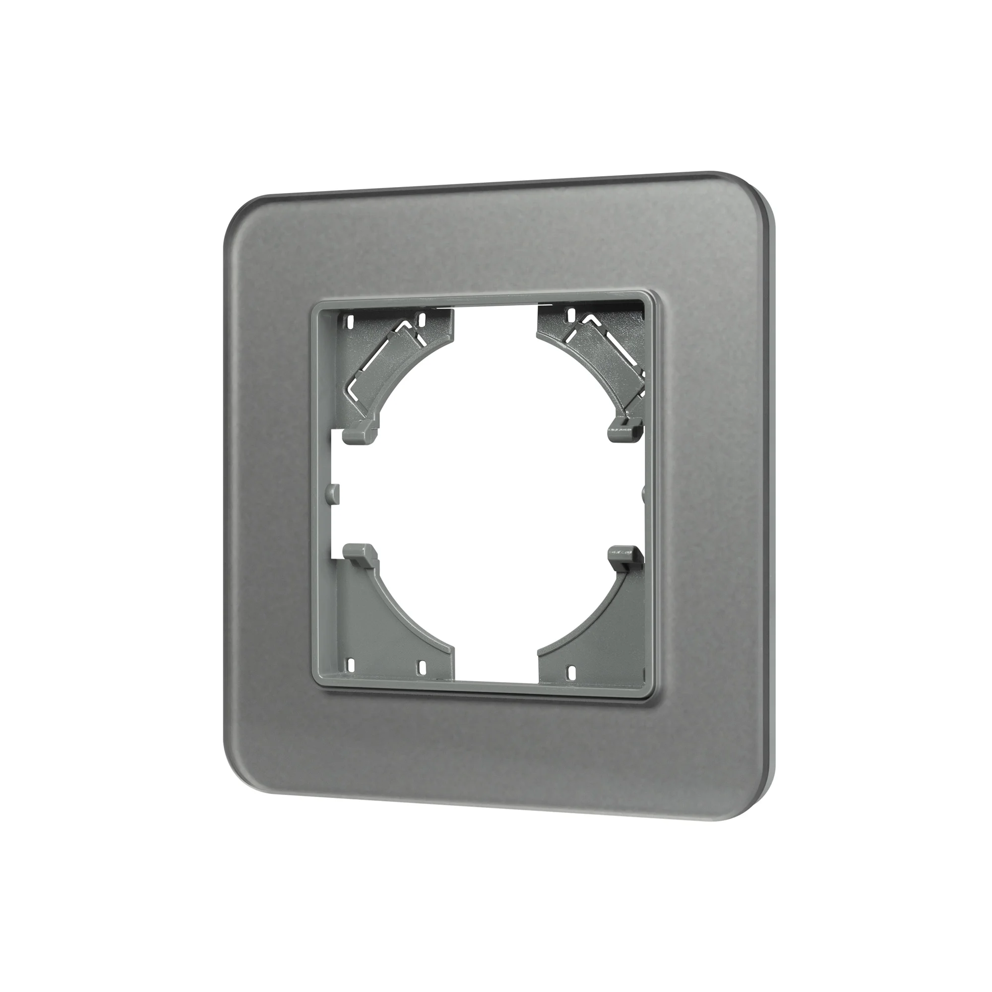 Рамка алюминиевая на 1 пост, под встраиваемый механизм. Вырез под функциональную часть — круг. Цвет — серый. Ориентации монтажа — горизонтальная и вертикальная. Габаритные размеры: длина 82 мм, ширина 82 мм, высота 10 мм. Гарантийный срок 12 мес. Рамка совместима только с механизмами арт. 043739/043740/043741