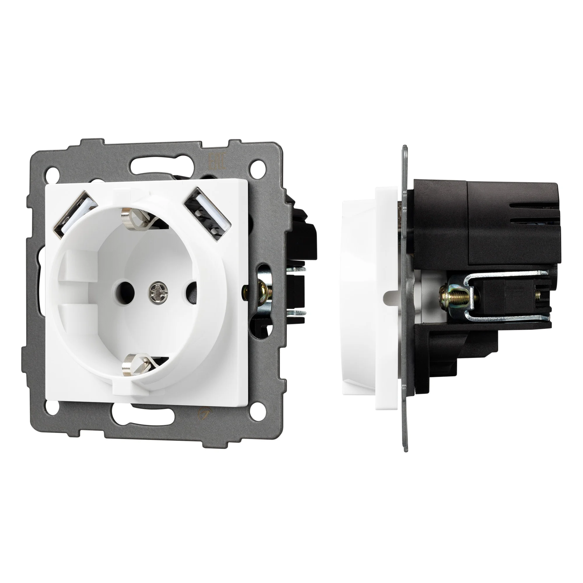 Механизм розетки с заземлением на 1 пост и 2USB Type A порта. Цвет — белый. Без фронтальной рамки. Уровень пылевлагозащиты IP20. Устанавливается в стандартный подрозетник. Габаритные размеры: длина 71 мм, ширина 71 мм, высота 53 мм. Гарантийный срок 10 лет.