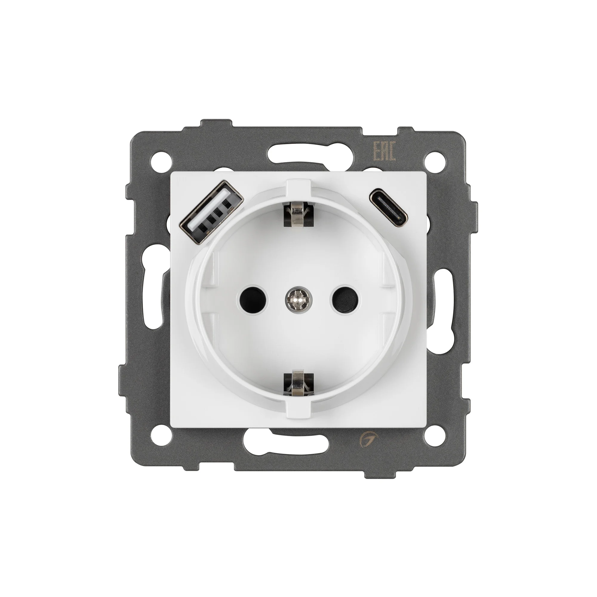 Механизм розетки с заземлением 1 пост 2 USB Type A+C порта. Цвет — белый. Без фронтальной рамки. Уровень пылевлагозащиты IP20. Устанавливается в стандартный подрозетник. Габаритные размеры: длина 71 мм, ширина 71 мм, высота 53 мм. Гарантийный срок 10 лет.