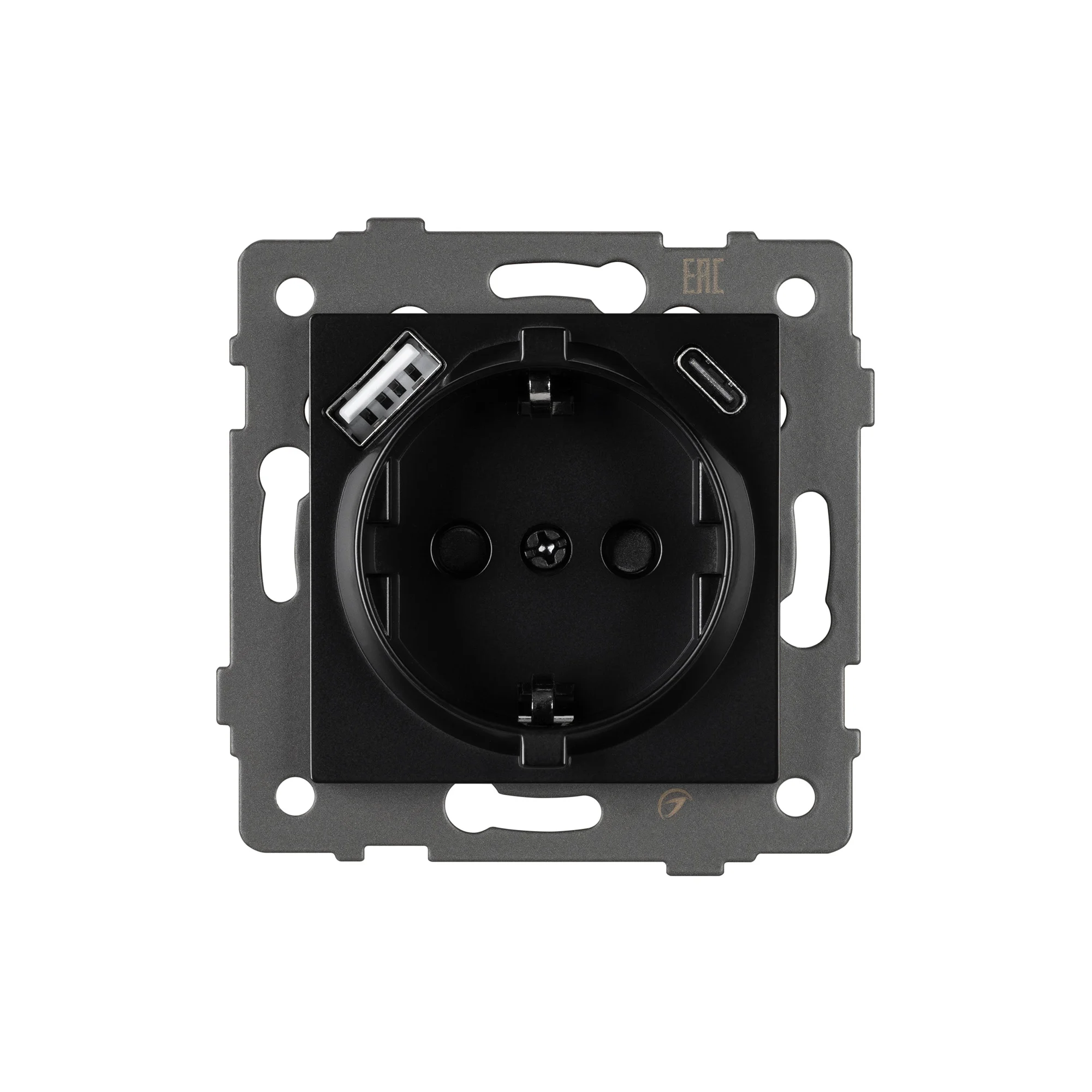 Механизм розетки с заземлением 1 пост 2 USB Type A+C порта. Цвет — черный. Без фронтальной рамки. Уровень пылевлагозащиты IP20. Устанавливается в стандартный подрозетник. Габаритные размеры: длина 71 мм, ширина 71 мм, высота 53 мм. Гарантийный срок 10 лет.