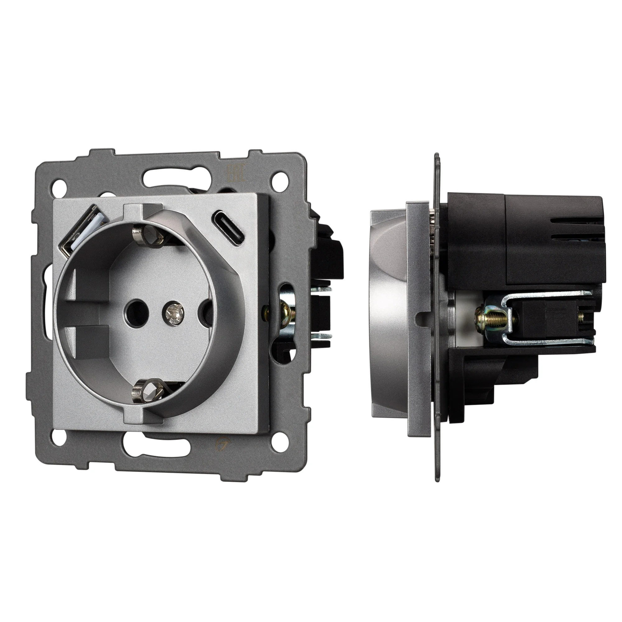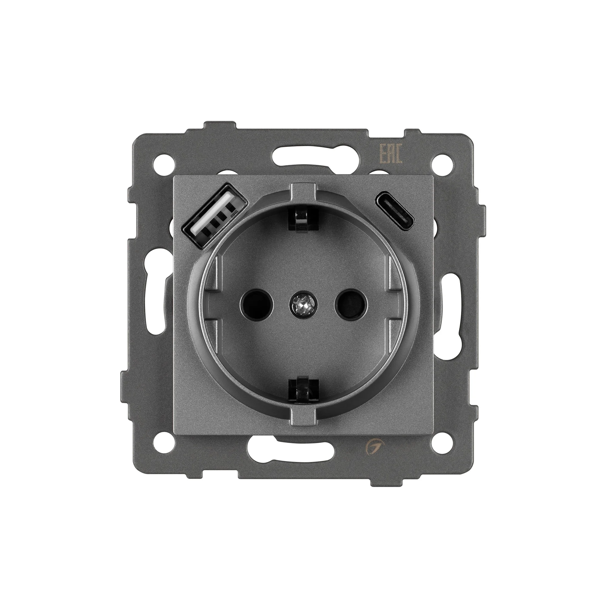 Механизм розетки с заземлением 1 пост 2 USB Type A+C порта. Цвет — серый. Без фронтальной рамки. Уровень пылевлагозащиты IP20. Устанавливается в стандартный подрозетник. Габаритные размеры: длина 71 мм, ширина 71 мм, высота 53 мм. Гарантийный срок 10 лет.