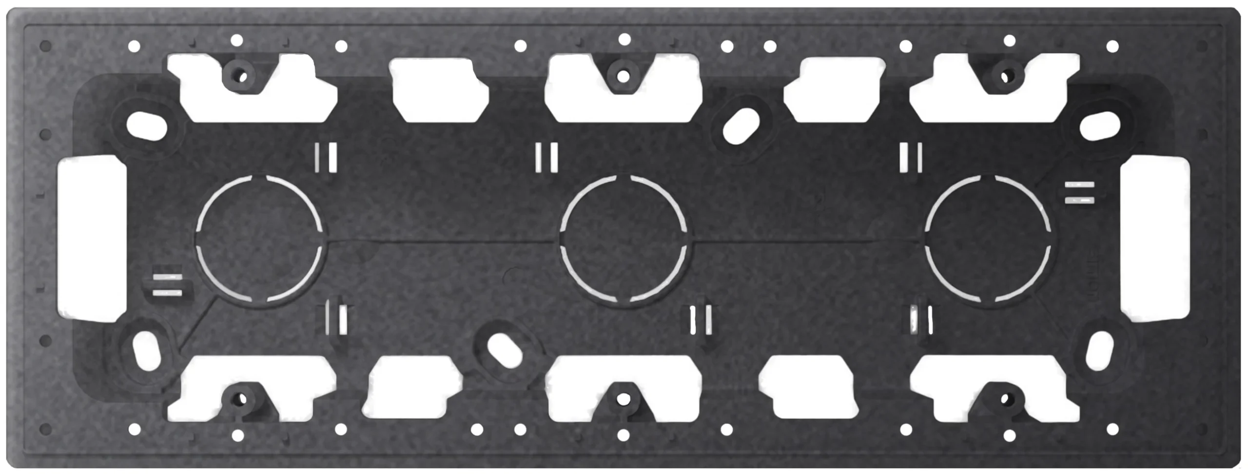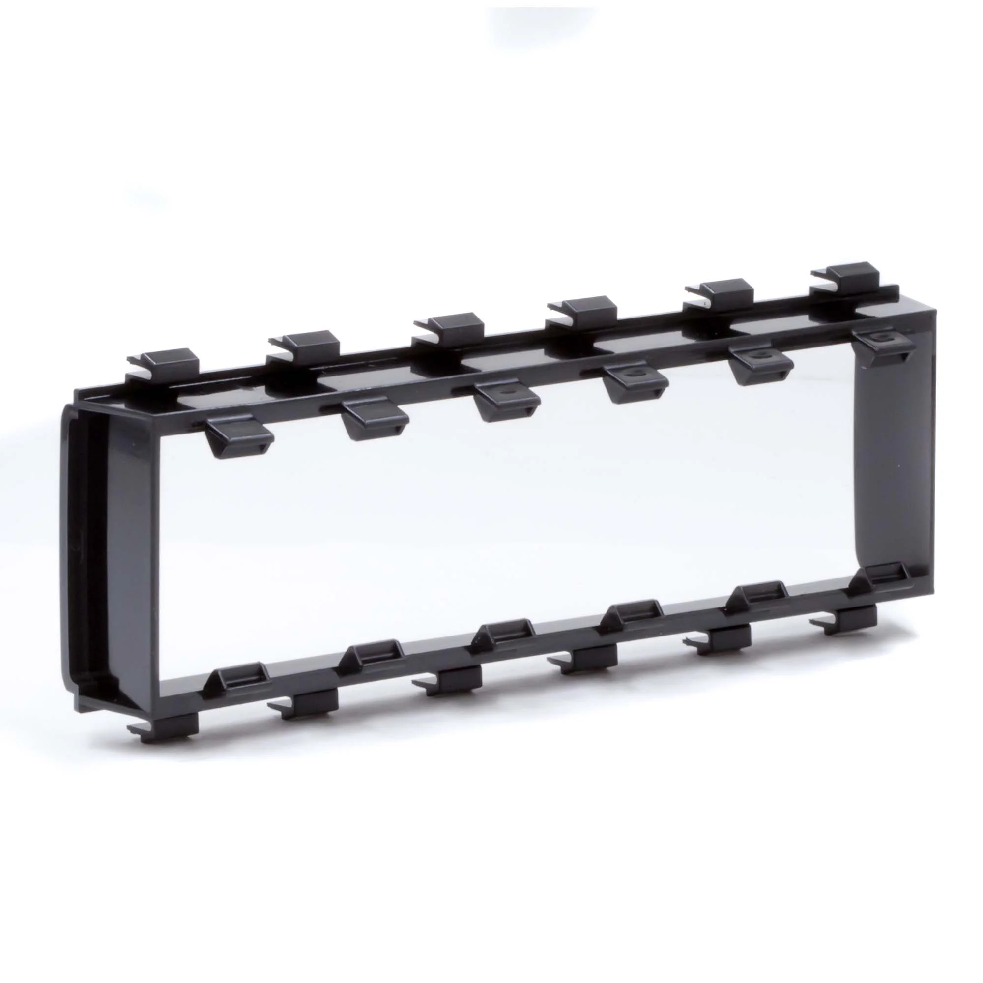 Рамка-суппорт на 6 модулей, PDA-3BN. Назначение: организация рабочих мест − монтаж электроустановочных изделий в пластиковые короба, тип TA-GN серии «In-liner Classic». Монтаж: монтаж суппорта внутри короба с помощью защелкивания, монтаж электроустановочных изделий в рамку − защелкиванием снаружи. Характеристики: материал – АБС-пластик и поликарбонат. Комплектация: рамка; суппорт. Типоразмер короба: 100х40, 100х60, 100х80. Цвет: белый