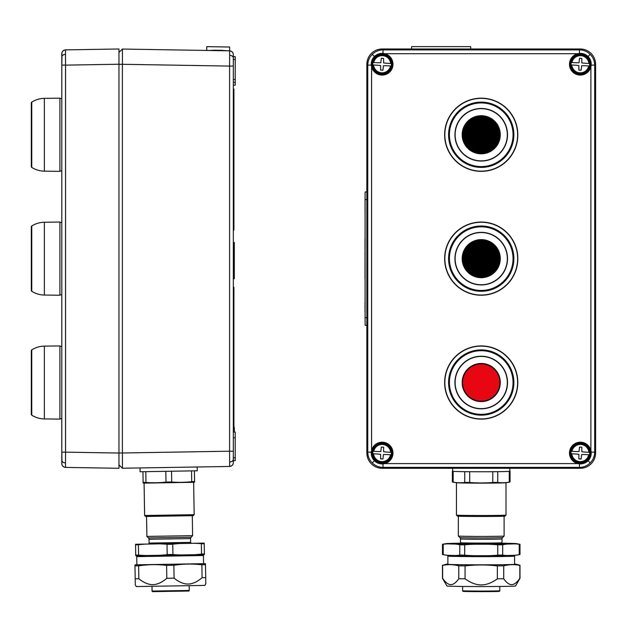Кнопочный пост шириной 80 мм, высотой 180 мм и глубиной 70 мм, в котором толкателем выступает 2 черных и красная кнопка .