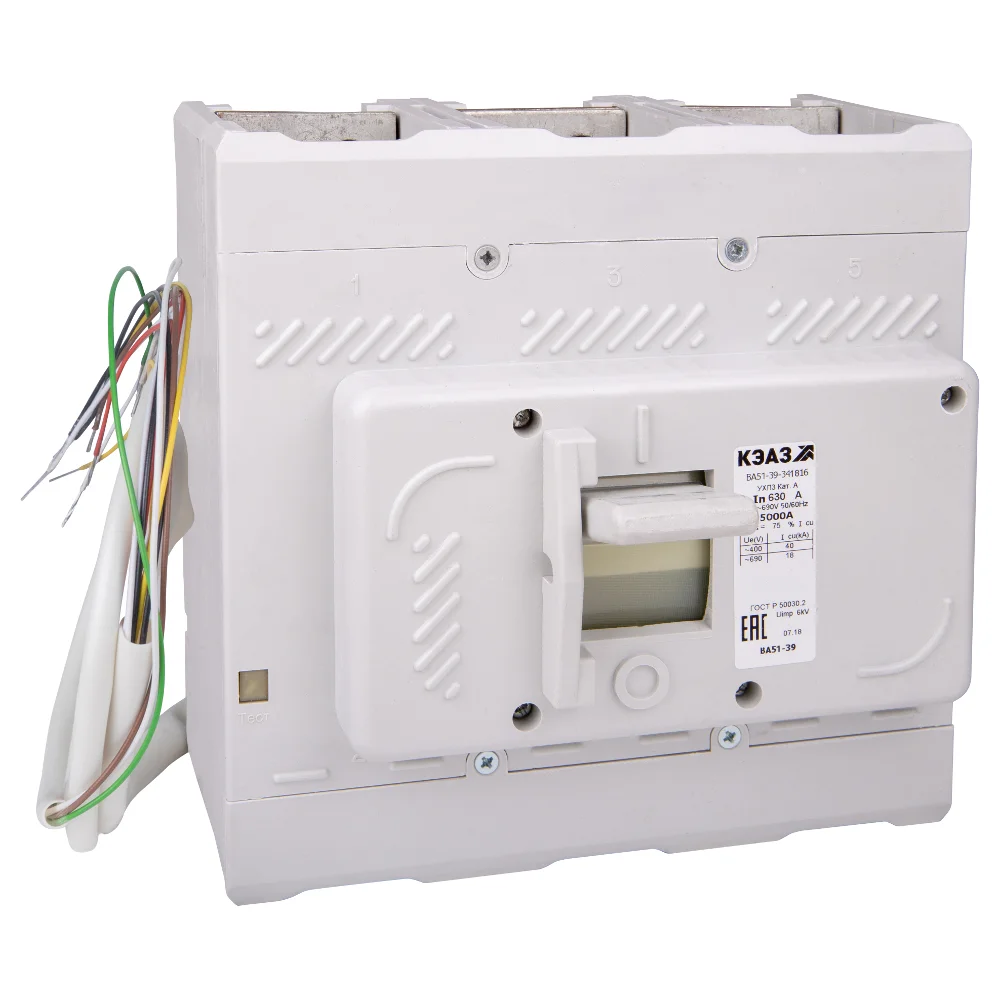 Блочный автоматический 3 полюсный выключатель переменного тока с предельной коммутационной способностью при переменном токе 40 кА на номинальный ток 630 А .