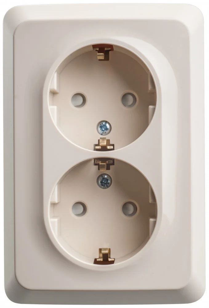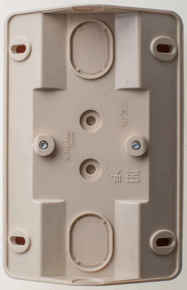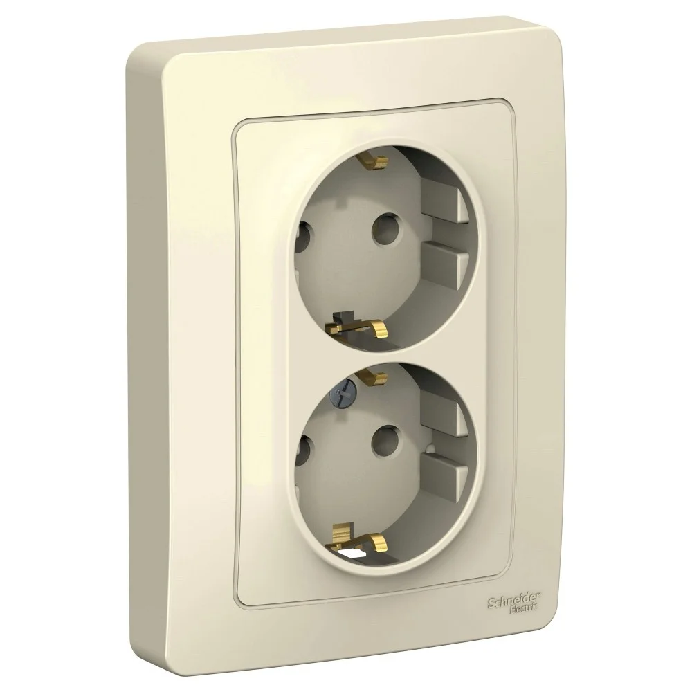 Розетка Systeme Electric (ранее Schneider Electric) ЭТЮД (кремовый, открытой установки) двухместная угловая с заземлением, без шторок предназначена для применения в сетях до 250В, на ток до 16А. Ее конструкция позволяет установить розетку в угол помещения. Шторки и заземление обеспечивают дополнительную безопасность при косвенных прикосновениях. Сделано в России.