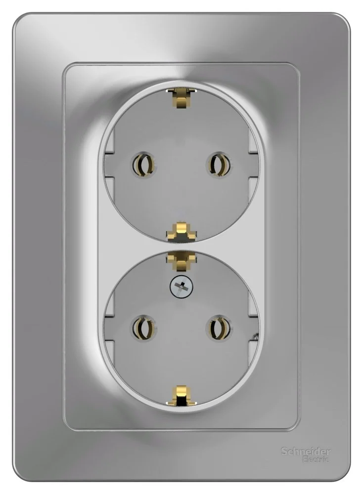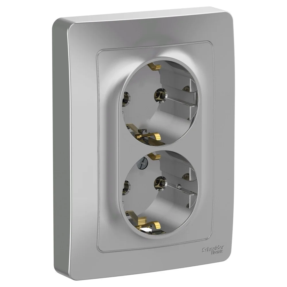 Розетка Systeme Electric (ранее Schneider Electric) BLANCA (алюминий, открытой установки) двухместная, с заземлением, шторками и изолирующей пластиной предназначена для сетей до 250В, на ток до 16А. Двухместная розетка позволяет подключить два устройства в одном месте. Шторки и заземление обеспечивают дополнительную безопасность при косвенном прикосновении.