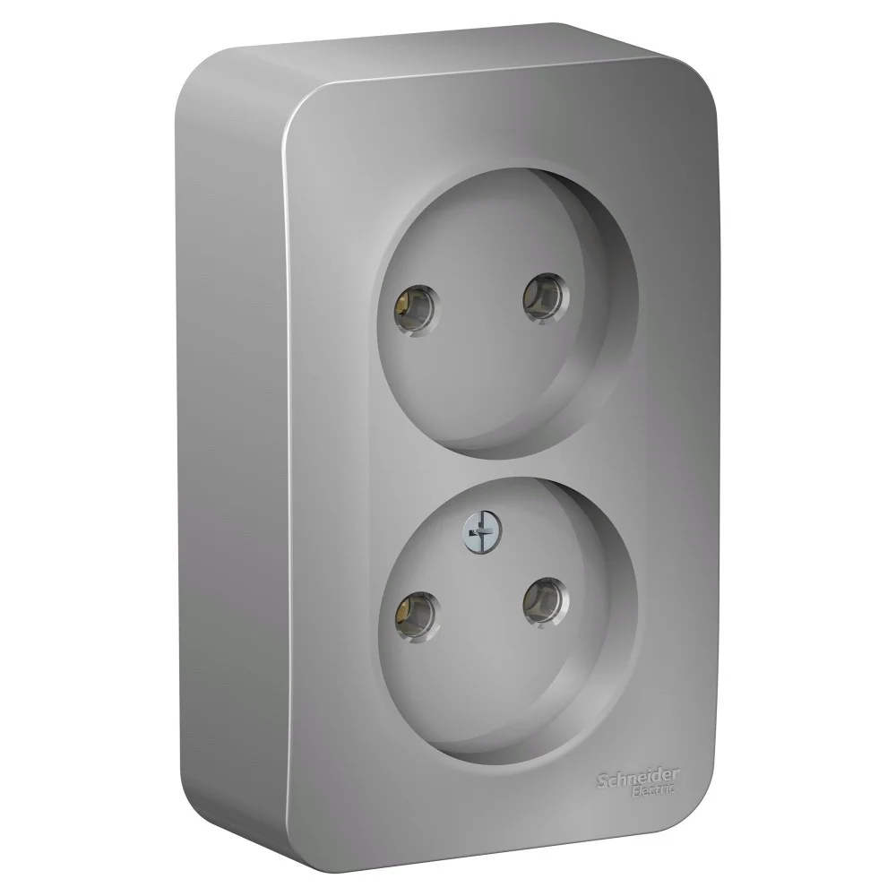 Розетка Systeme Electric (ранее Schneider Electric) BLANCA (алюминий, открытой установки) двухместная, без шторок и заземления, с изолирующей пластиной предназначена для сетей до 250В, на ток до 16А. Двухместная розетка позволяет подключить два устройства в одном месте. Она изготовлена из ABS-пластика, проста в установке и удобна в применении.