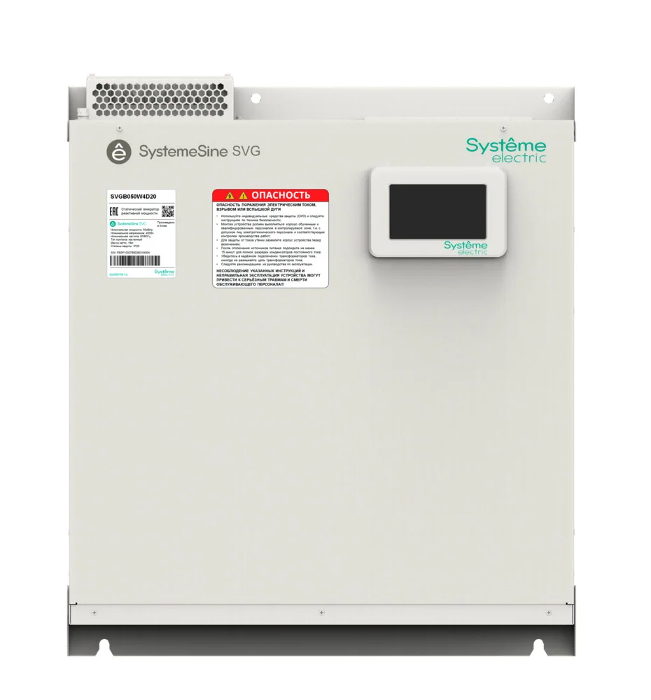 Статический генератор реактивной мощности торговой марки Systeme Electric серии SystemeSine типа SVG, номинальная мощность 50кВАр, номинальное напряжение 400В, степень защиты IP20, навесной модуль с встроенным 4,3 дюймовым ЖК дисплеем