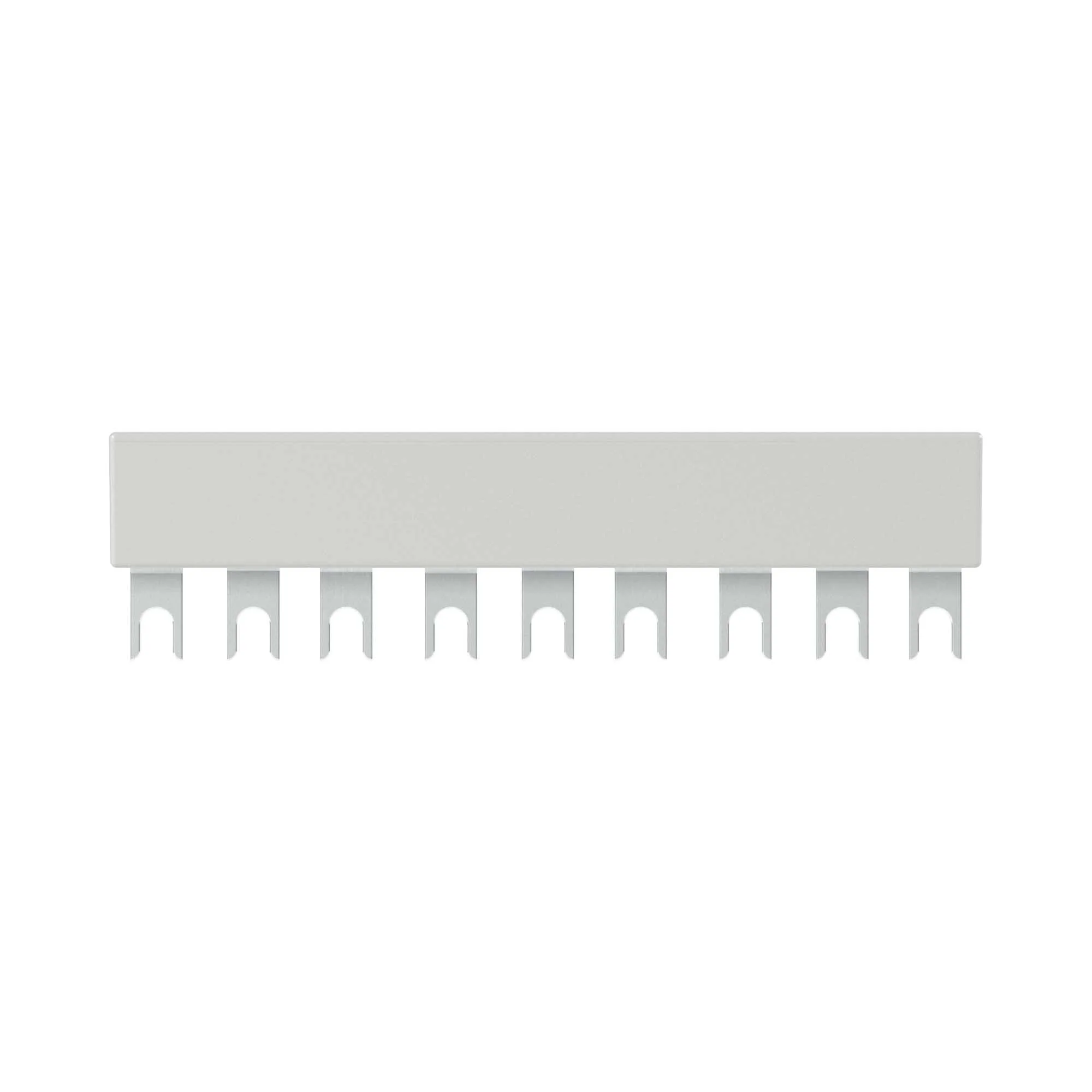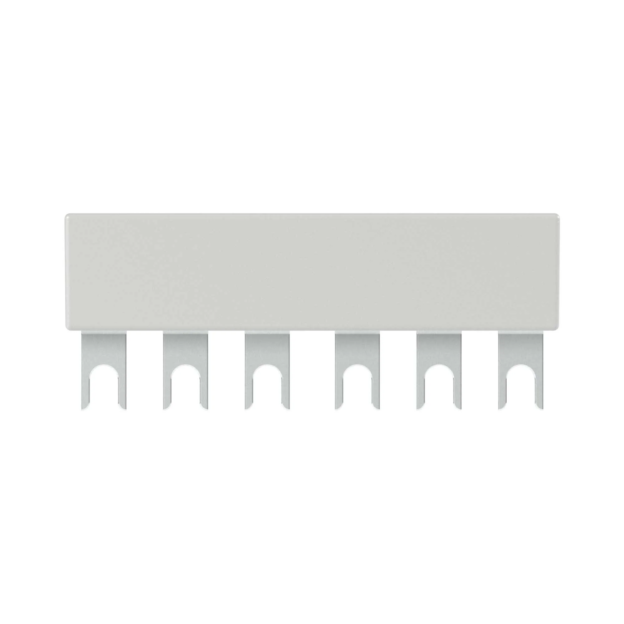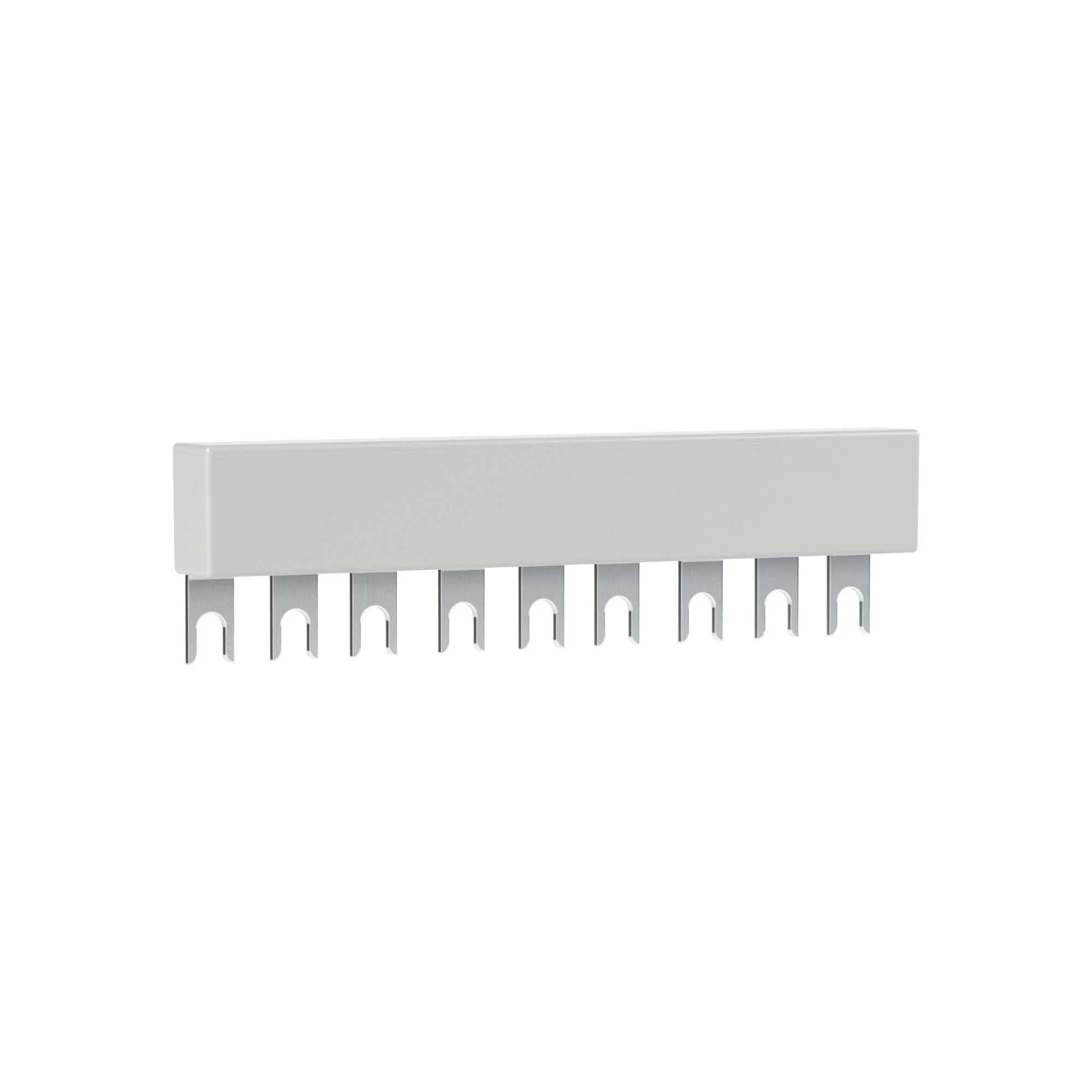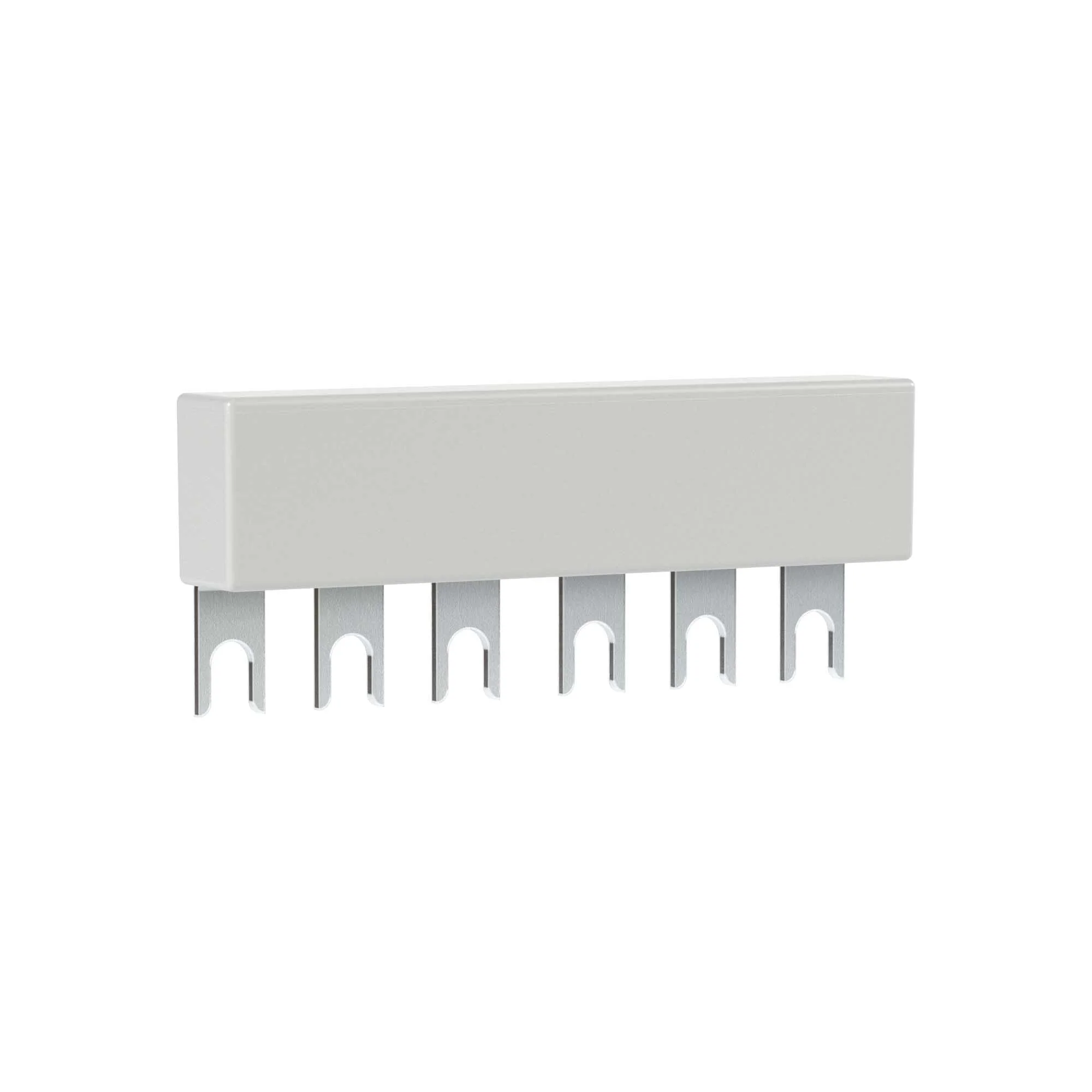 Комплект трехполюсных шин для автоматических выключателей серии SystemePact GM2, на номинальный ток до 63А, исполнение – 2 модуля по 45 мм, монтаж – сверху выключателей. Шины предназначены для правильного и надежного подключения к источнику питания нескольких автоматических выключателей, установленных на одну DIN-рейку.