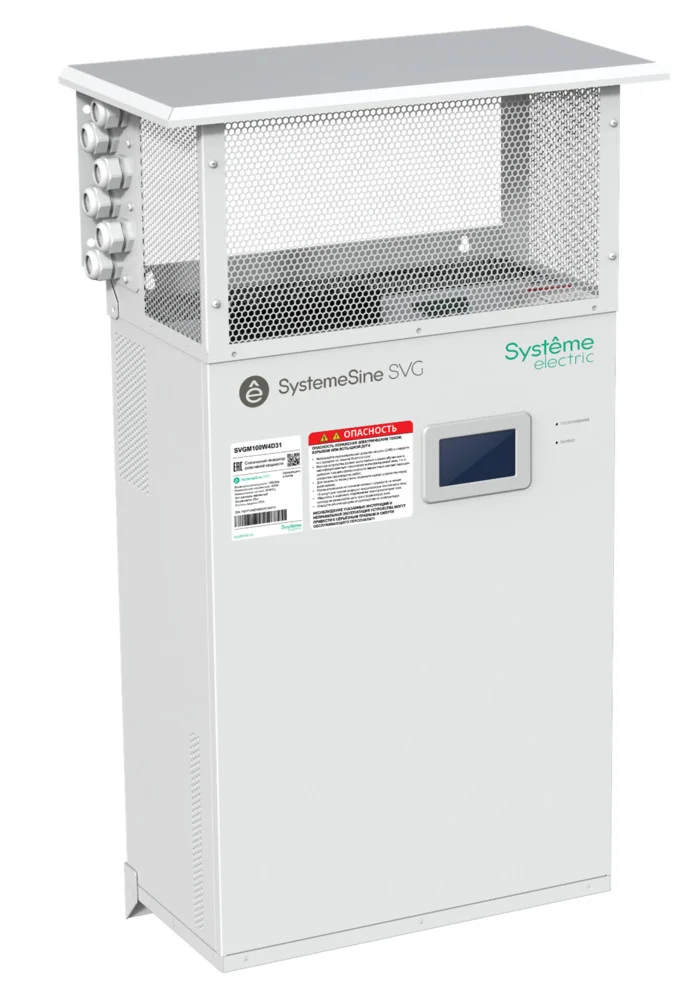 Статический генератор реактивной мощности торговой марки Systeme Electric серии SystemeSine типа SVG, номинальная мощность 100кВАр, номинальное напряжение 400В, степень защиты IP31, навесной модуль с встроенным 4,3 дюймовым ЖК дисплеем, ЭМС фильтром и портом RS-422
