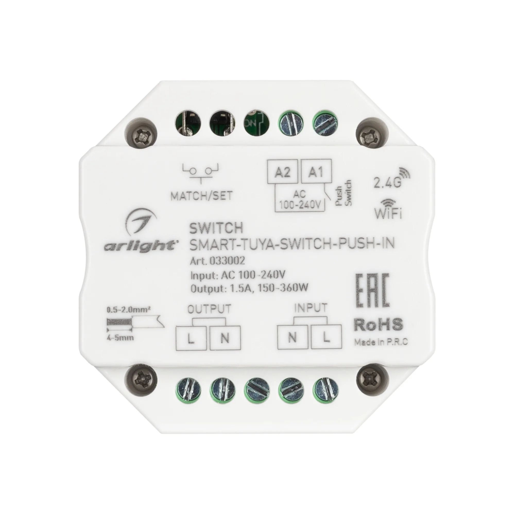 Выключатель для любых видов нагрузки AC 230V. Напряжение питания AC 100-240V, максимальный ток нагрузки 1.5А. Управление 2.4G+WiFi, интерфейс Tuya, поддерживается управление ЯНДЕКС АЛИСА, совместим с приложением INTELLIGENT ARLIGHT. Мощность указана для одиночных нагрузок (см. даташит). Поддерживает функцию Push-Switch. Габариты 52x52x26 мм. Совместим с пультами и панелями SMART.