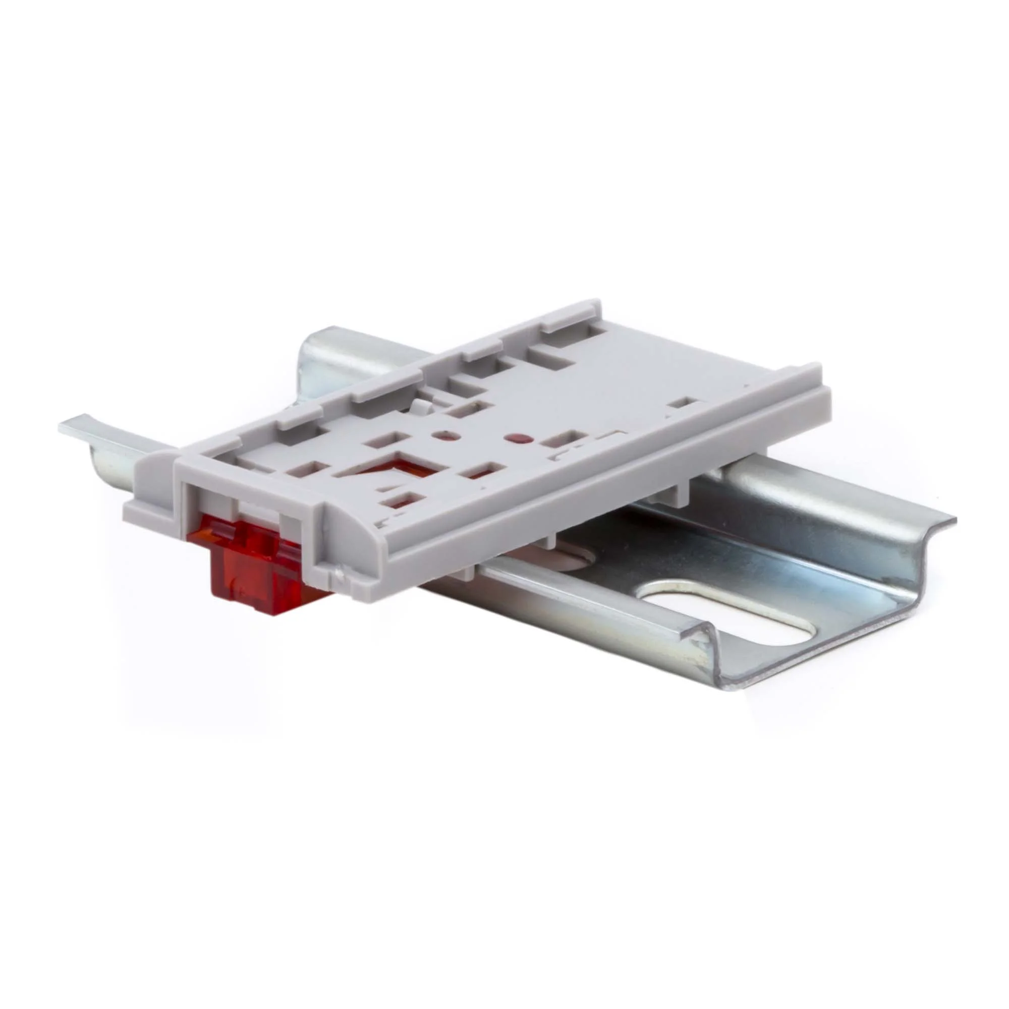 Адаптер для вертикального монтажа распределительных блоков DTP1 на DIN-рейку шириной 15 и 35 мм. Крепление распределительной колодки перпендикулярно DIN-рейке. Материал – полиамид, класс негорючести – UL94 V0, цвет – серый. Тип фиксации — защелка. Габариты (В×Ш×Г) – 10,7×28,8×58,4 мм.