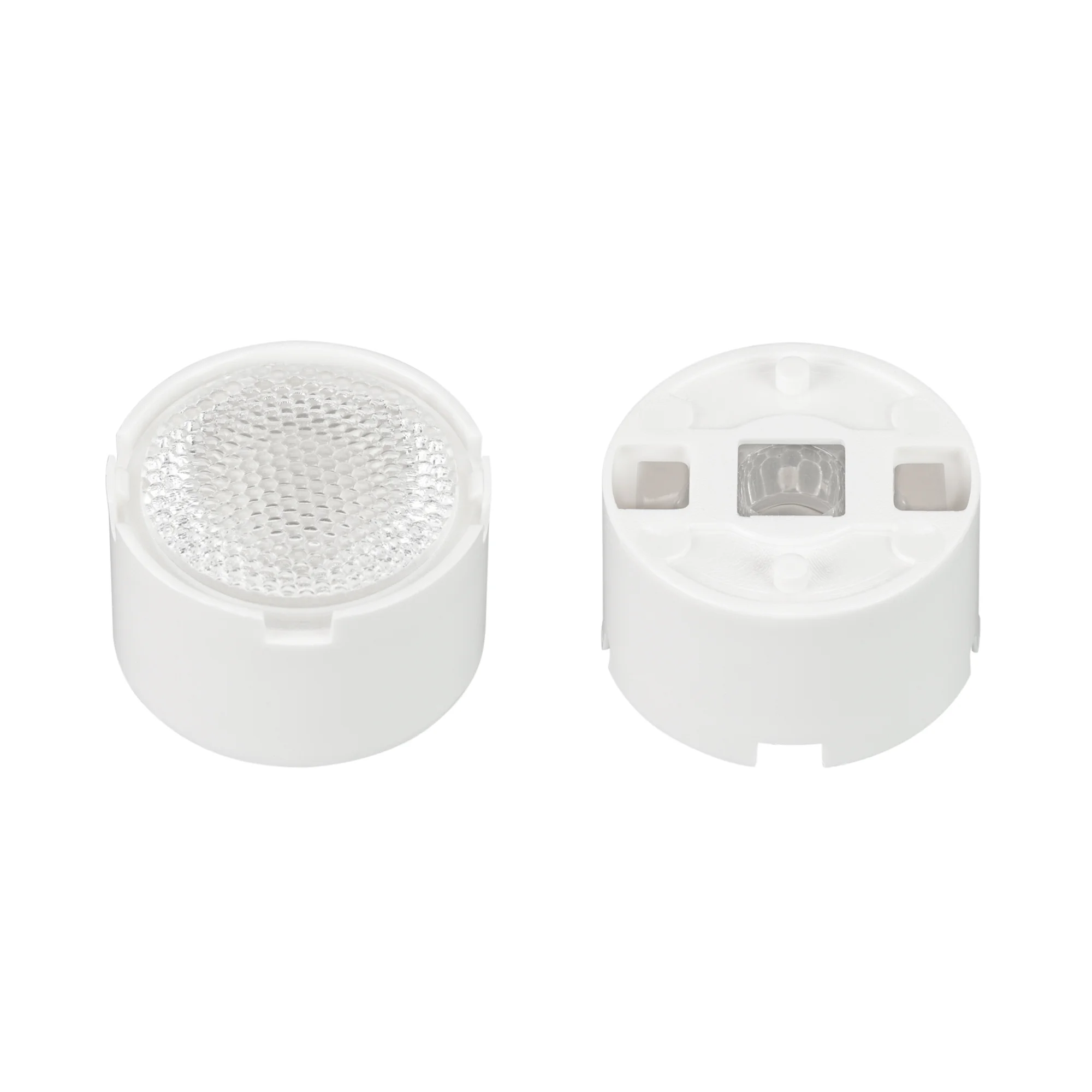 Поставка под заказ от 1800 шт. Одиночная линза со съемным холдером белого цвета для светодиодов SMD: 2525, 2835, 3030, 3535, 5050. Угол обзора: вертикальный 45°, прозрачная микропризма. Материал PMMA. Диаметр 19.5 мм, высота 11.76 мм. Кратность заказа поставщику: 100 шт.