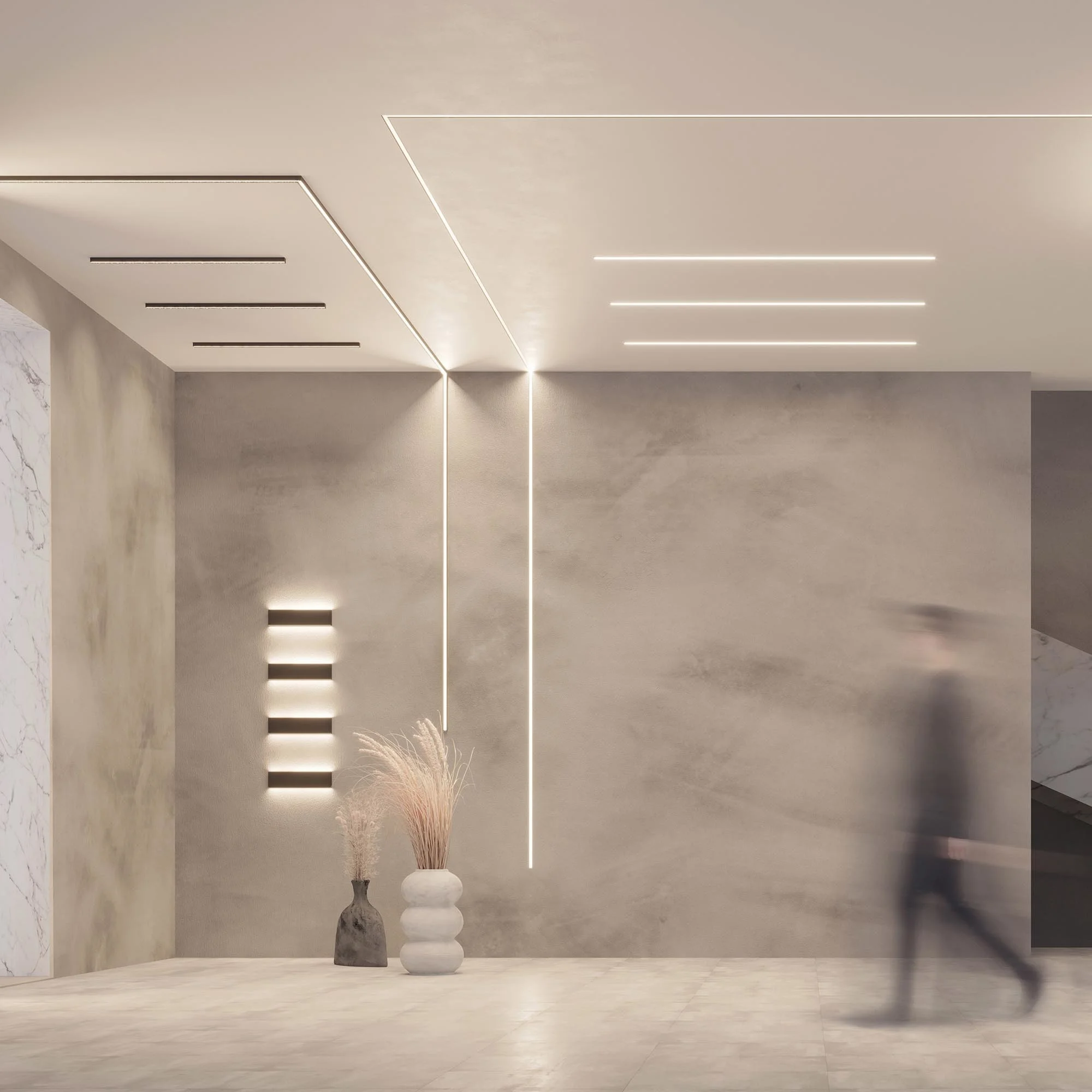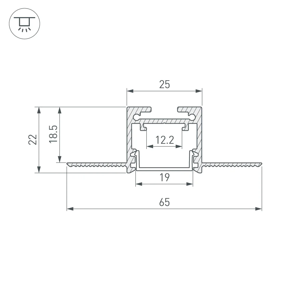 Алюминиевый профиль для светодиодных лент и линеек. Скрытая установка (под строительную отделку). Цвет — черный RAL9005 (порошковая окраска). Габаритные размеры (L×W×H): 2500x65x22 мм. Ширина площадки для ленты 12,2 мм. Экраны, заглушки и другие аксессуары приобретаются отдельно. Цена за 1 метр. Кратность заказа поставщику: 2.5 м.