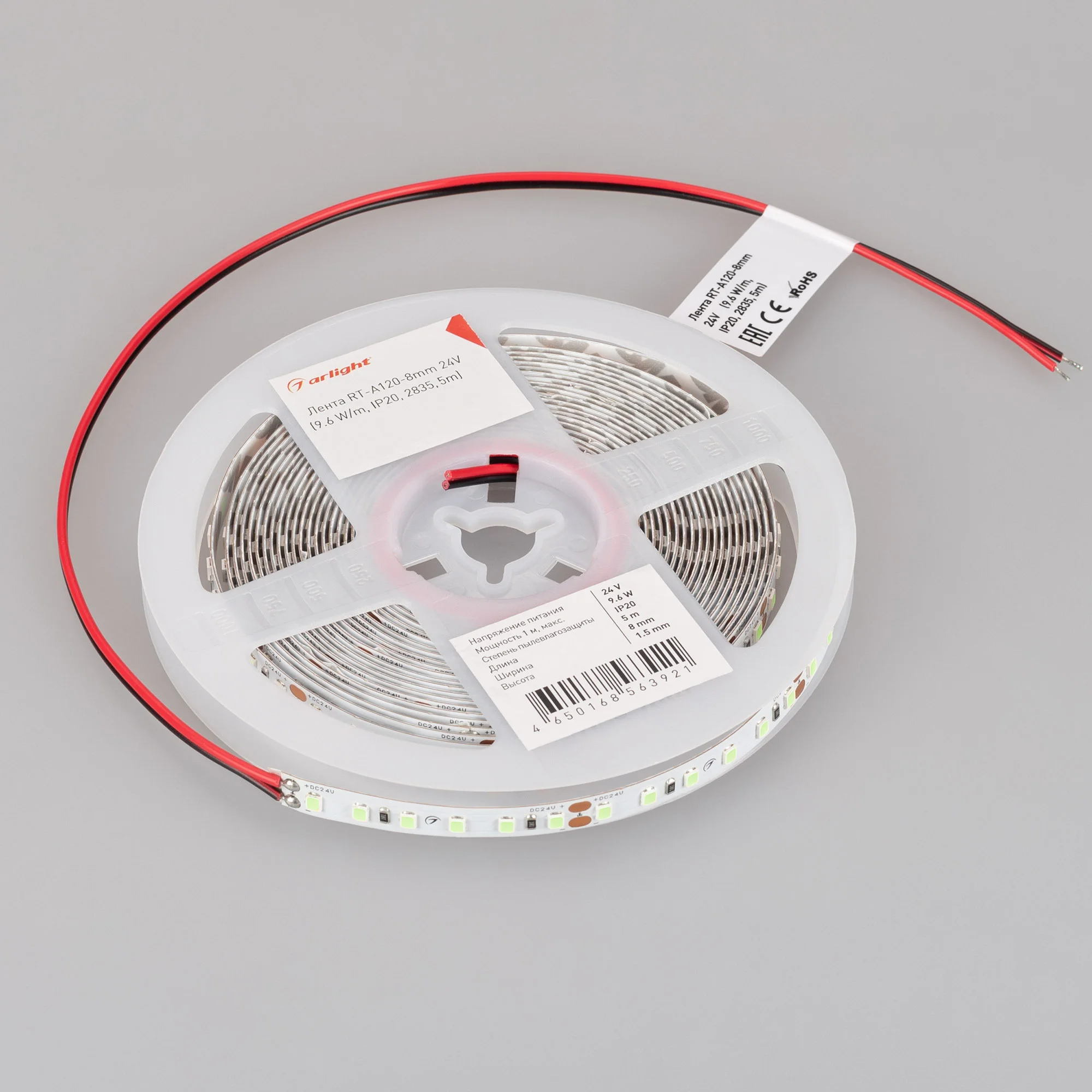 Светодиодная лента RT серии A120. Светодиоды SMD 2835, 120 шт/м, белая плата шириной 8 мм, скотч 3M. Цвет БИРЮЗОВЫЙ, угол 120°. Питание 24 В, мощность 9.6 Вт/м (48 Вт на 5 м). Размеры 5000x8x1.5 мм. Мин. отрезок 50 мм, 6 светодиодов. Цена за 1 м. Рекомендуется установка на профиль. Кратность заказа поставщику: 5 м.