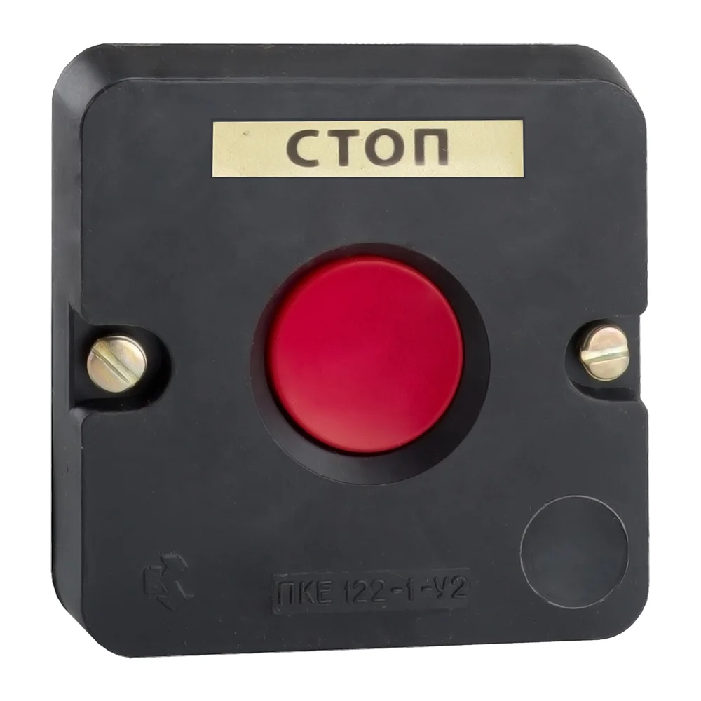 Кнопочный пост шириной 74 мм, высотой 74 мм и глубиной 54 мм, в котором толкателем выступает красная кнопка .