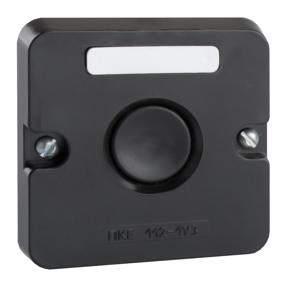 Кнопочный пост шириной 74 мм, высотой 74 мм и глубиной 54 мм, в котором толкателем выступает черная кнопка .