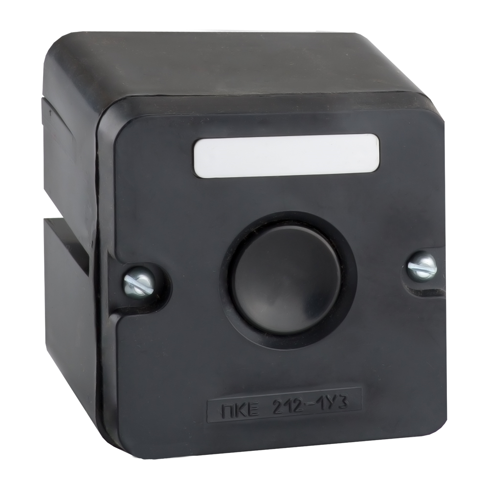 Кнопочный пост шириной 74 мм, высотой 74 мм и глубиной 54 мм, в котором толкателем выступает черная кнопка .