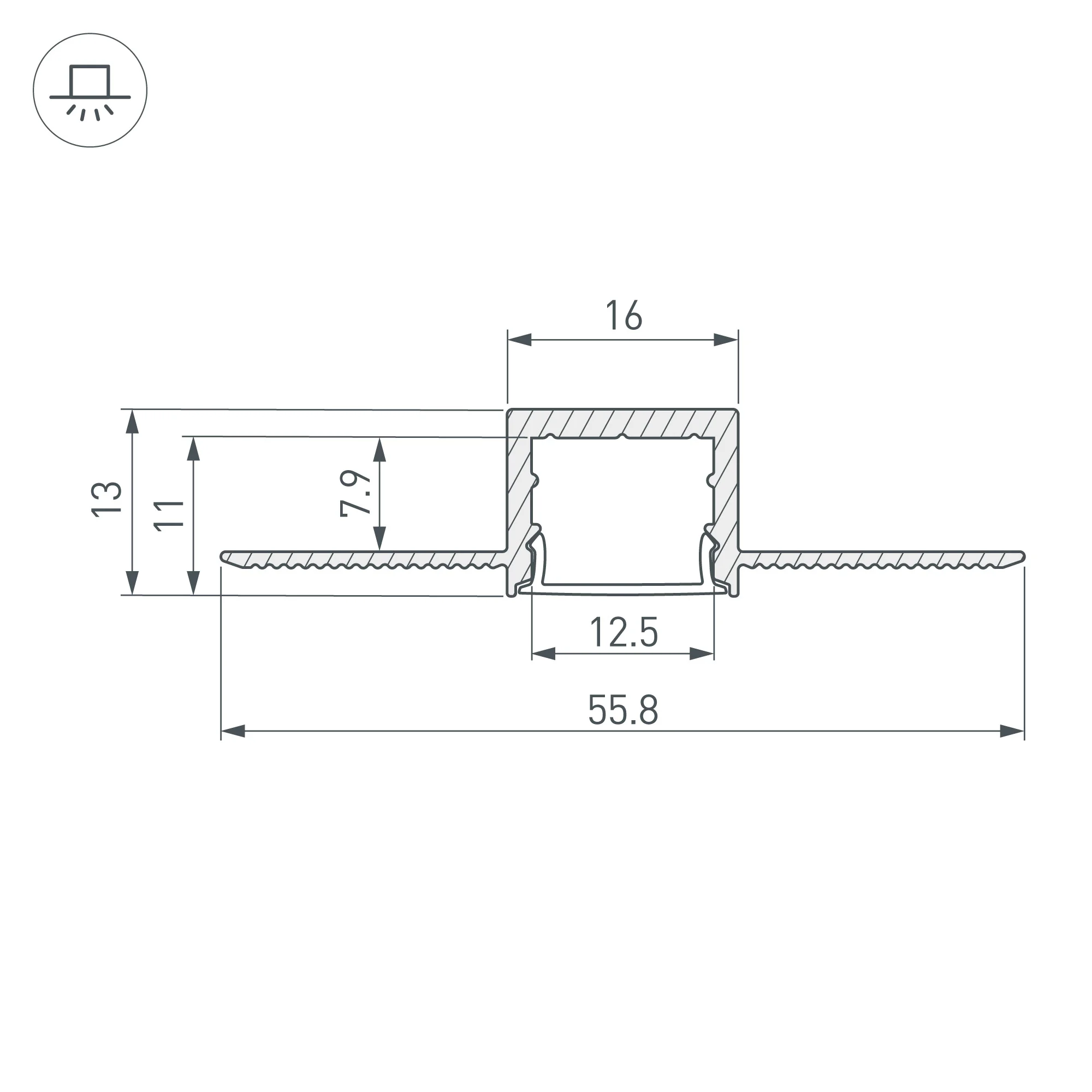 Алюминиевый анодированный профиль для светодиодных лент и линеек. Скрытая установка (под строительную отделку). Габаритные размеры (L×W×H): 2000×55,8×13 мм. Ширина площадки для ленты 12,5 мм. Экраны, заглушки и другие аксессуары приобретаются отдельно. Цена за 1 метр. Кратность заказа поставщику: 2 м.